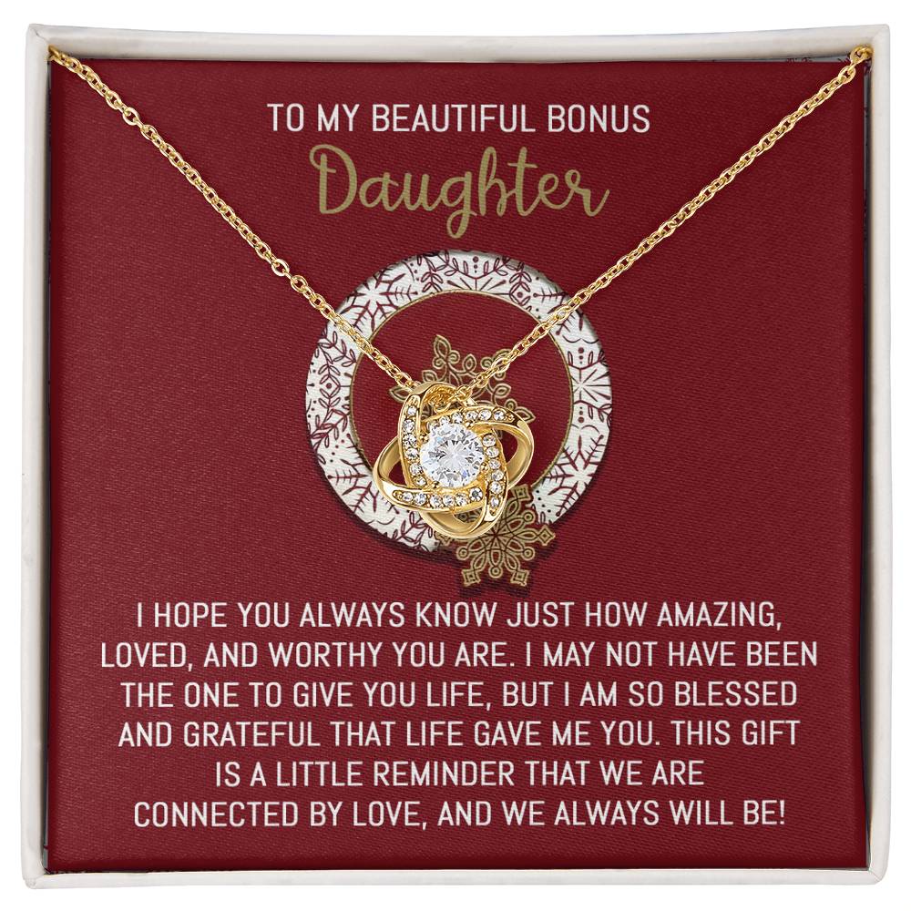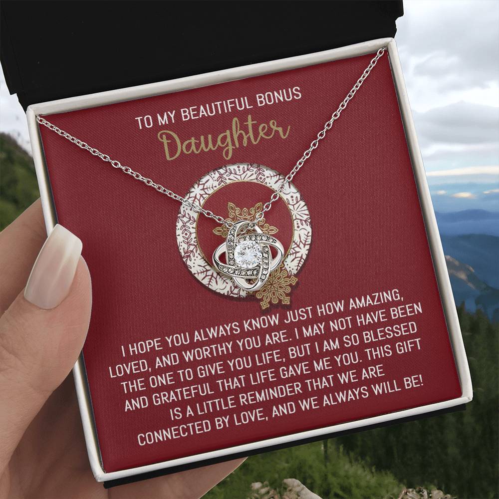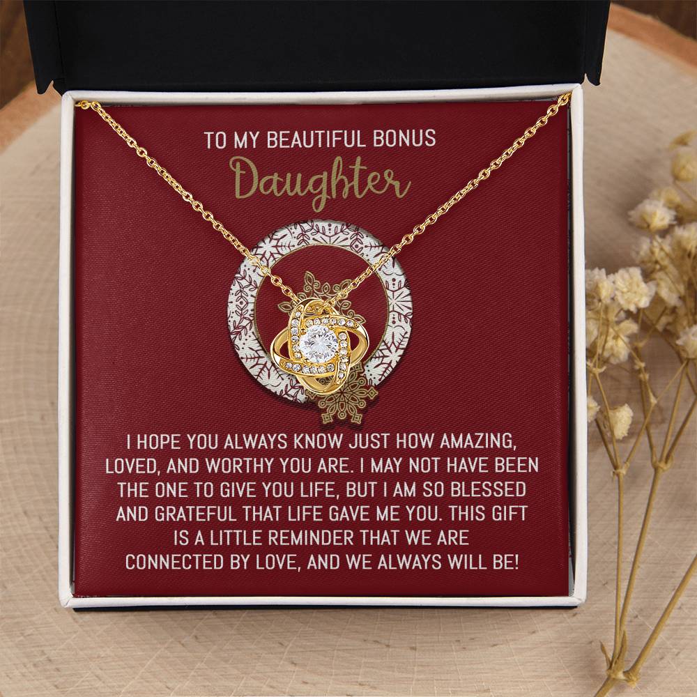 Your Bonus Duaghter will be overwhelmed with joy, her eyes welling up with tears when she receives this Love Knot Necklace and your heartfelt message letting her know how much she means and how much you love her.