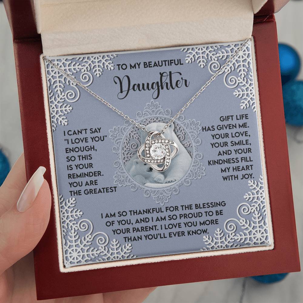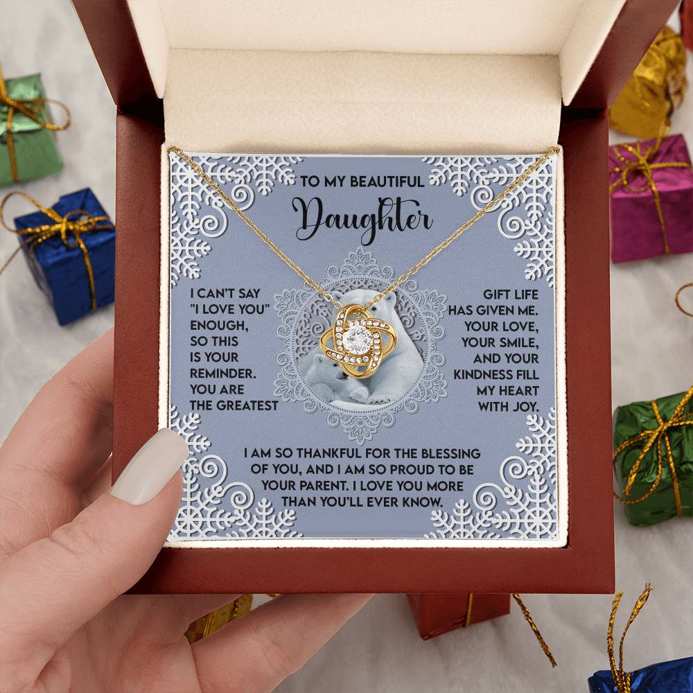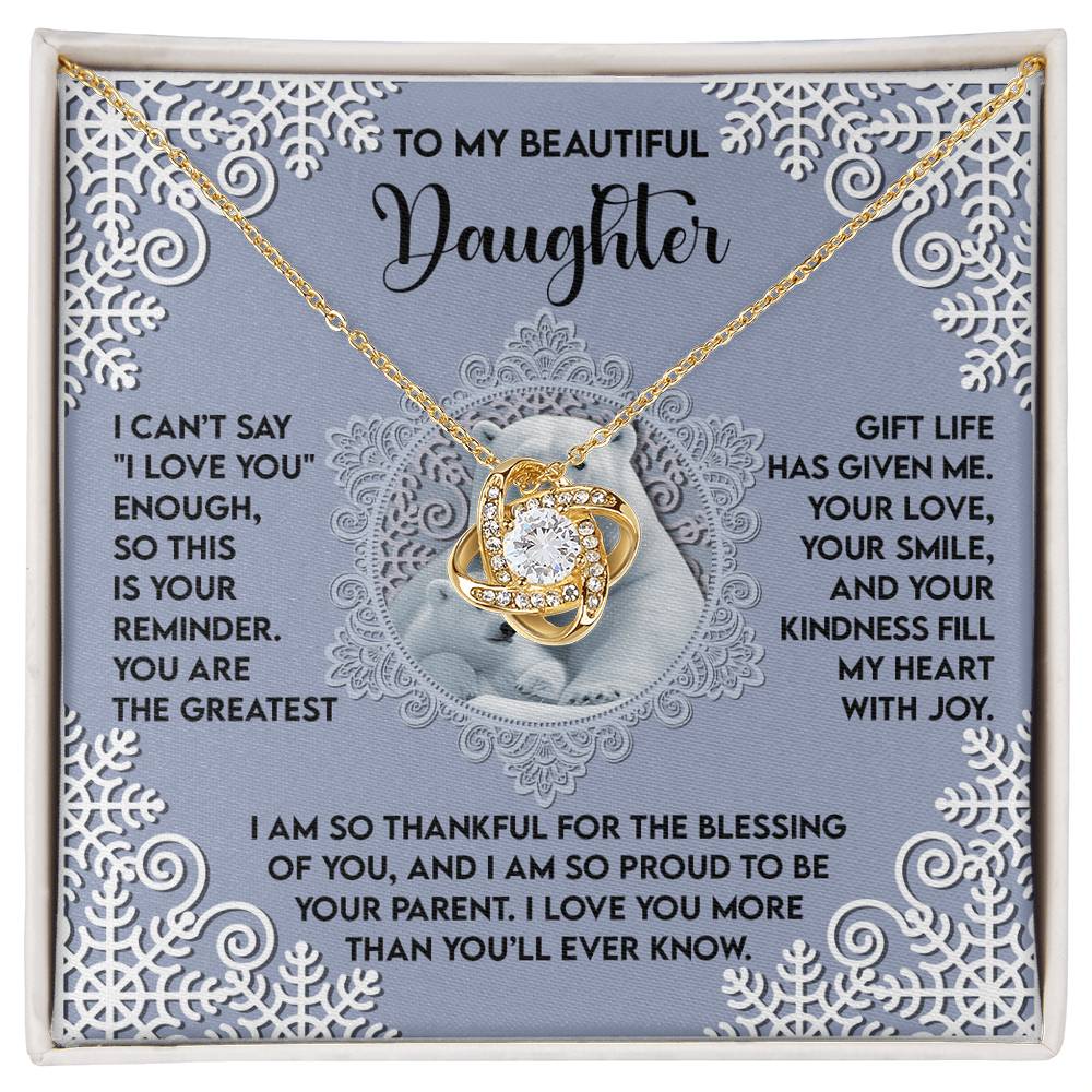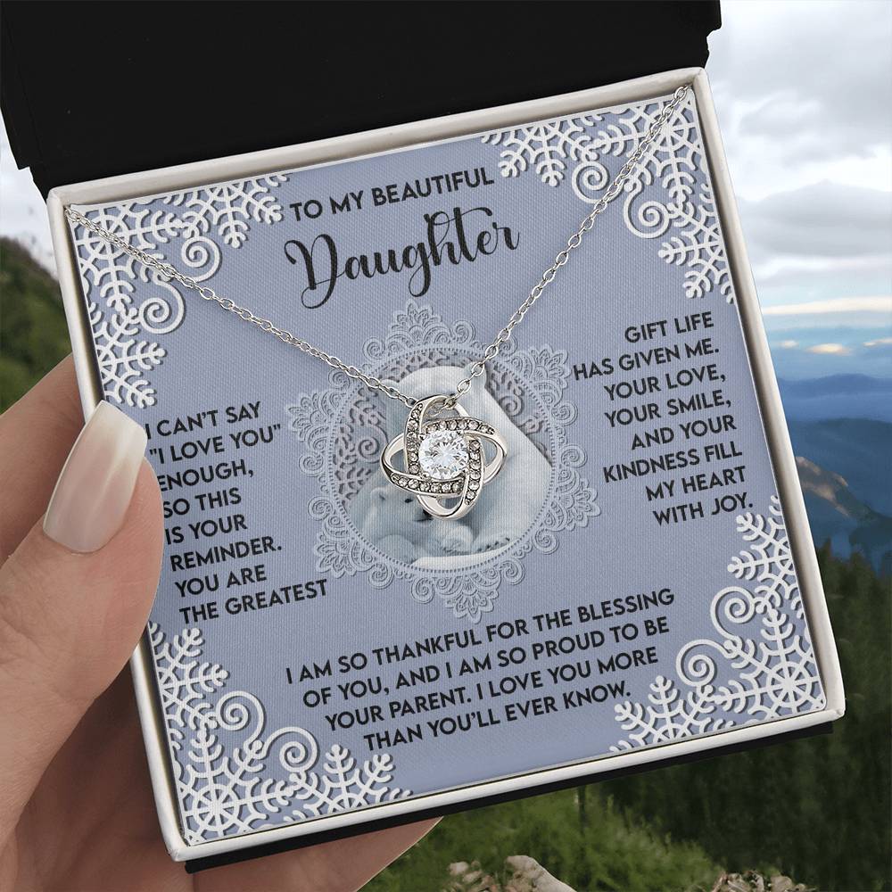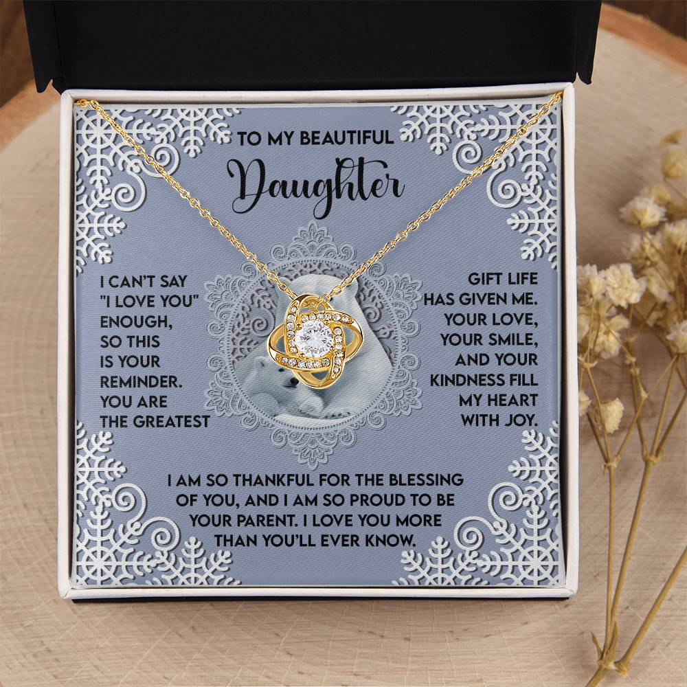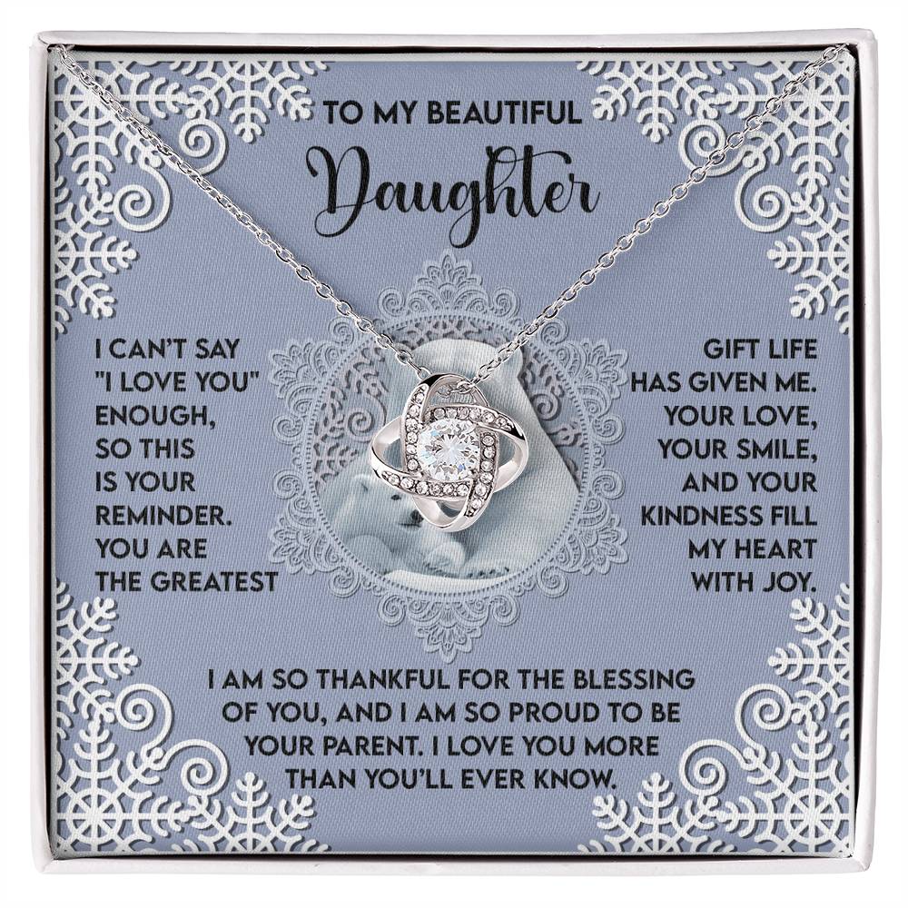 Your Daughter will be overwhelmed with joy, her eyes welling up with tears when she receives this Love Knot Necklace and your heartfelt message letting her know how much she means and how much you love her.