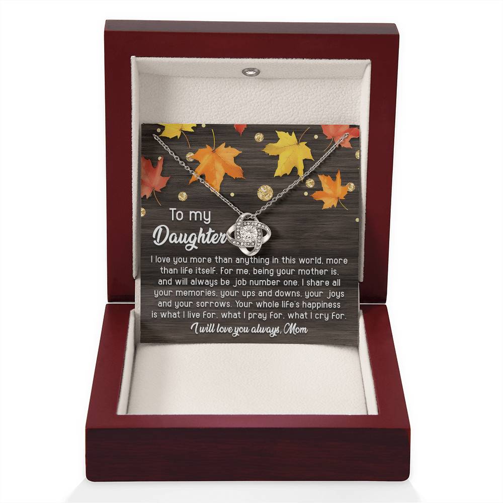 Your daughter will be overwhelmed with joy, her eyes welling up with tears when she receives this Love Knot Necklace and your heartfelt message letting her know how much she means and how much you love her.
