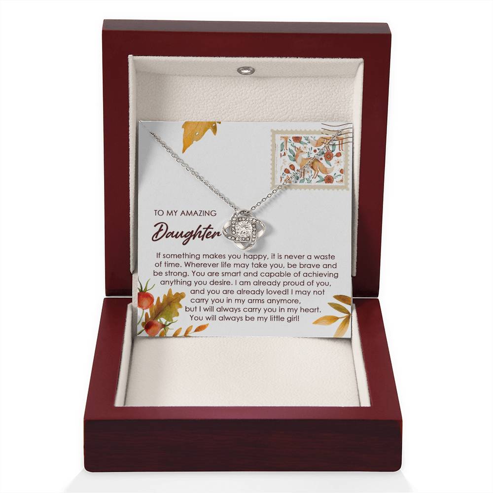 Your daughter will be overwhelmed with joy, her eyes welling up with tears when she receives this Love Knot Necklace and your heartfelt message letting her know how much she means and how much you love her.