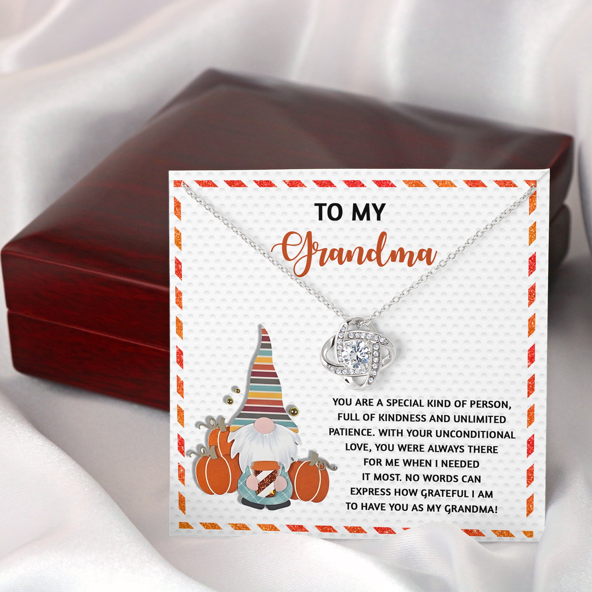 Your Grandmother will be overwhelmed with joy, her eyes welling up with tears when she receives this Love Knot Necklace and your heartfelt message letting her know how much she means and how much you love her.