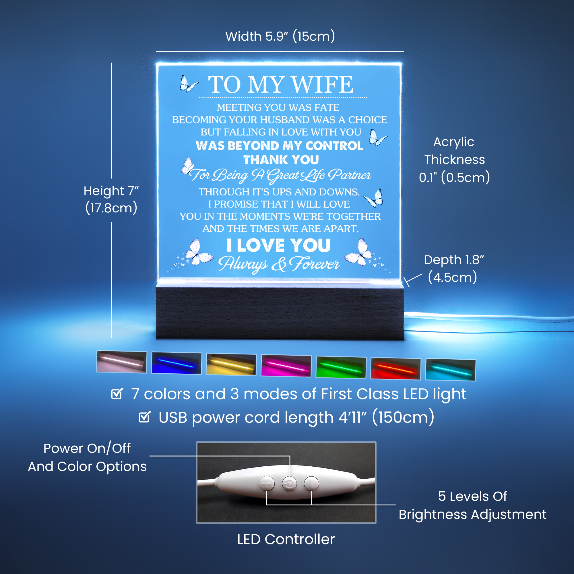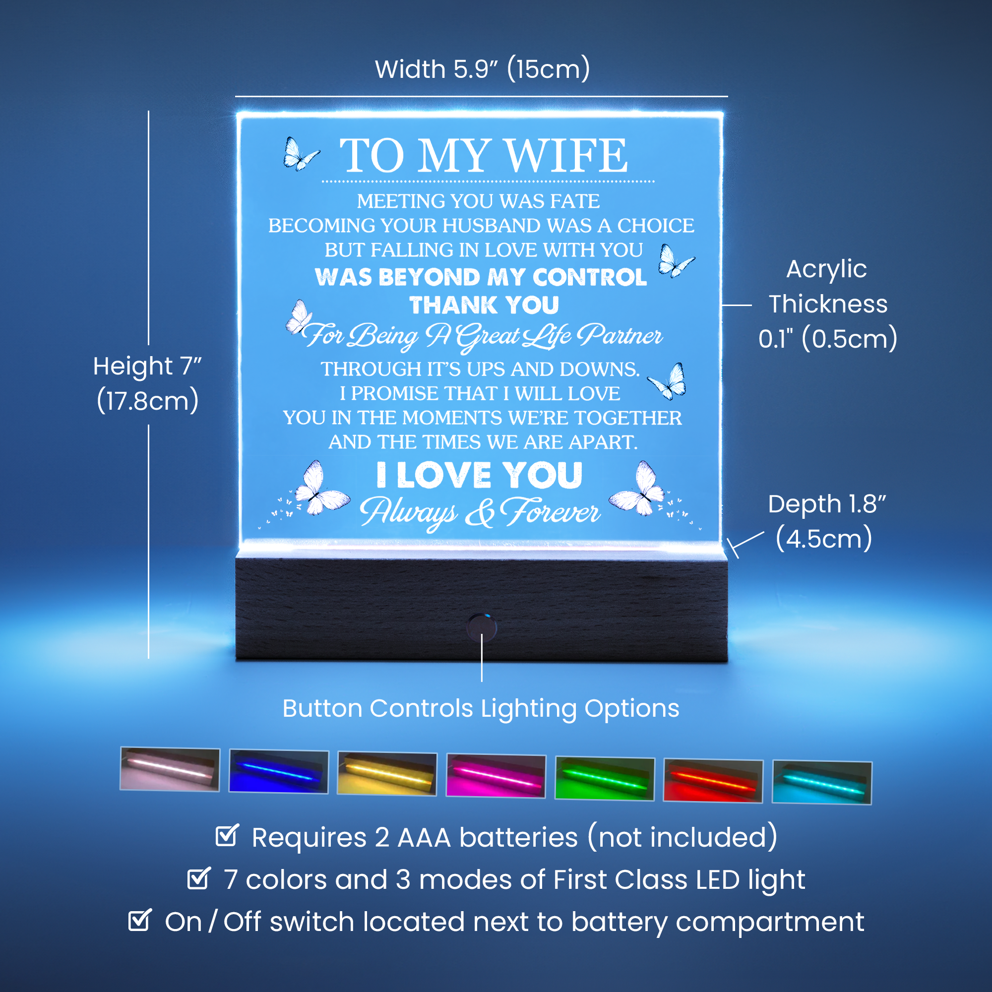 Your plaque will be crafted from premium acrylic with a professionally printed design for a polished look. It comes with a stylish wooden LED base, Â and you can choose between a USB plug-in option: