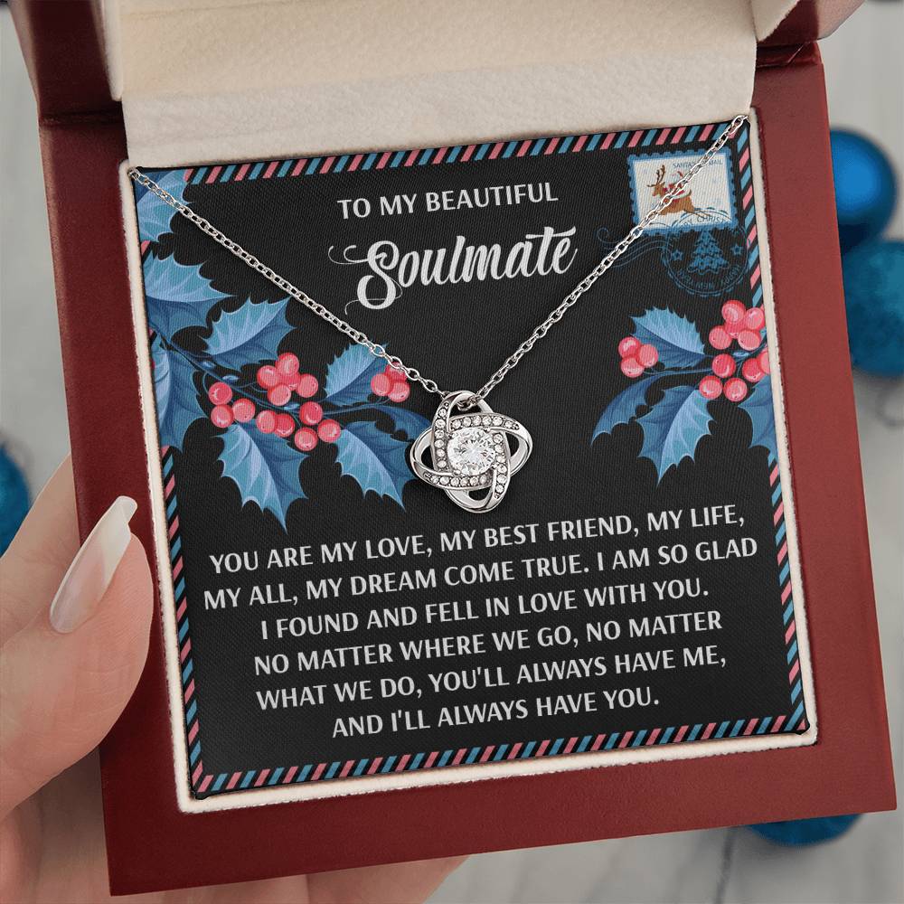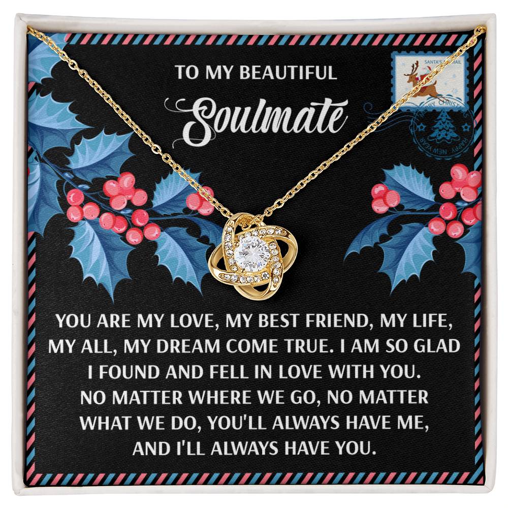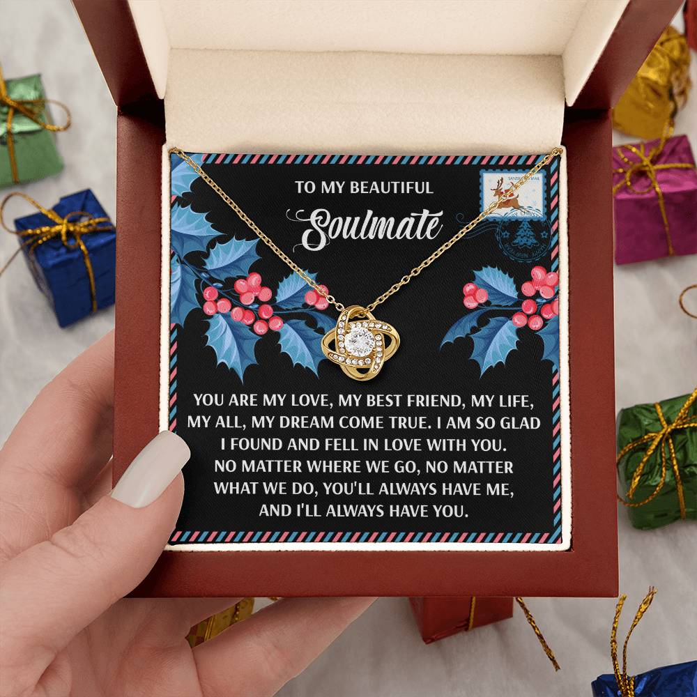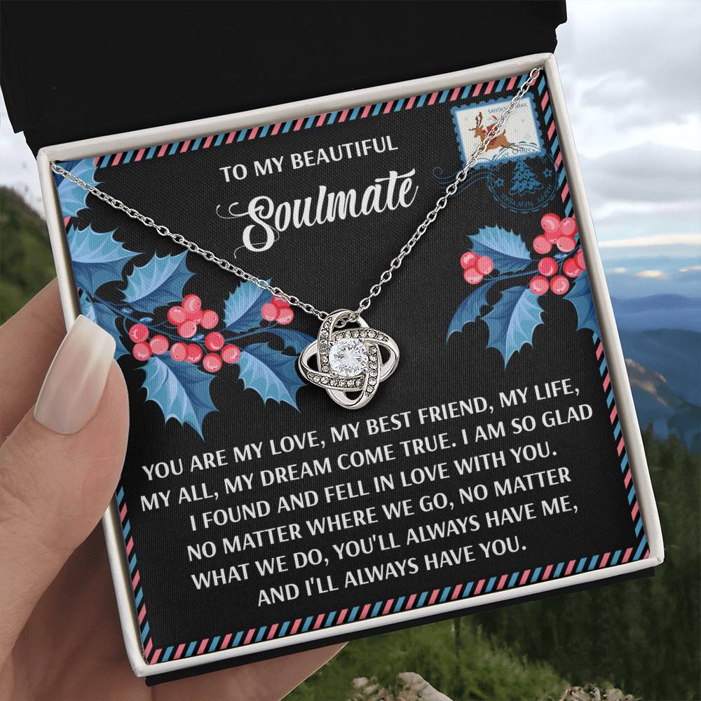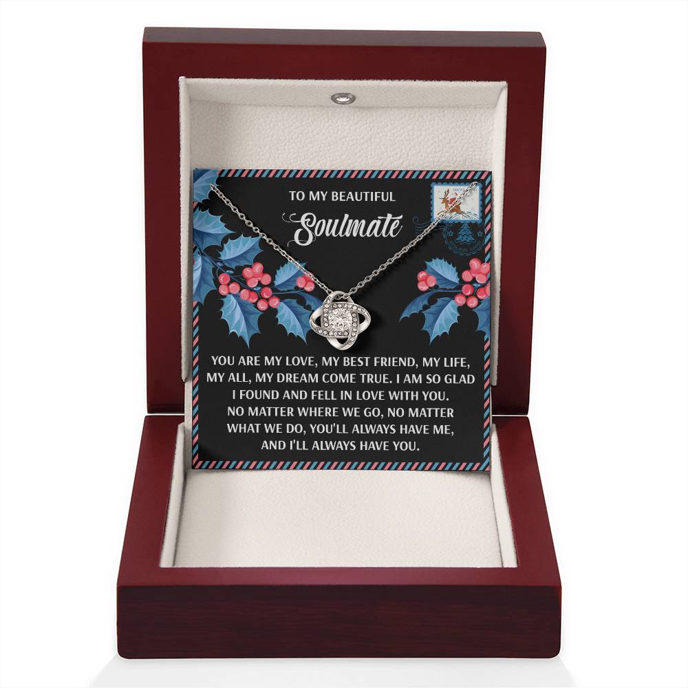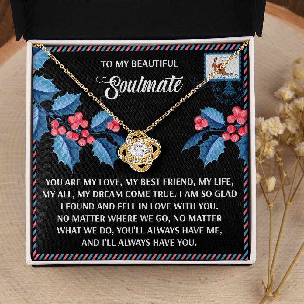 Your Soulmate will be overwhelmed with joy, her eyes welling up with tears when she receives this Love Knot Necklace and your heartfelt message letting her know how much she means and how much you love her.