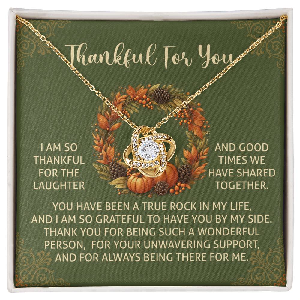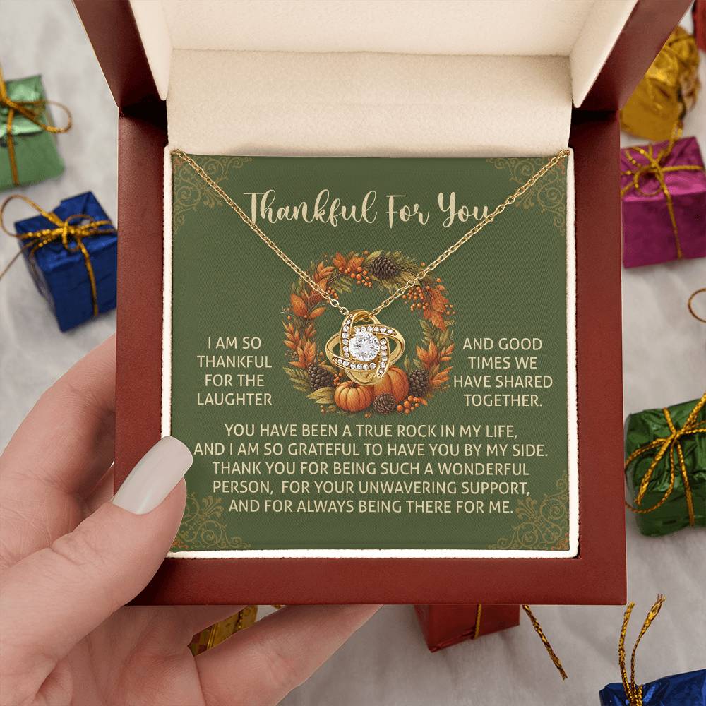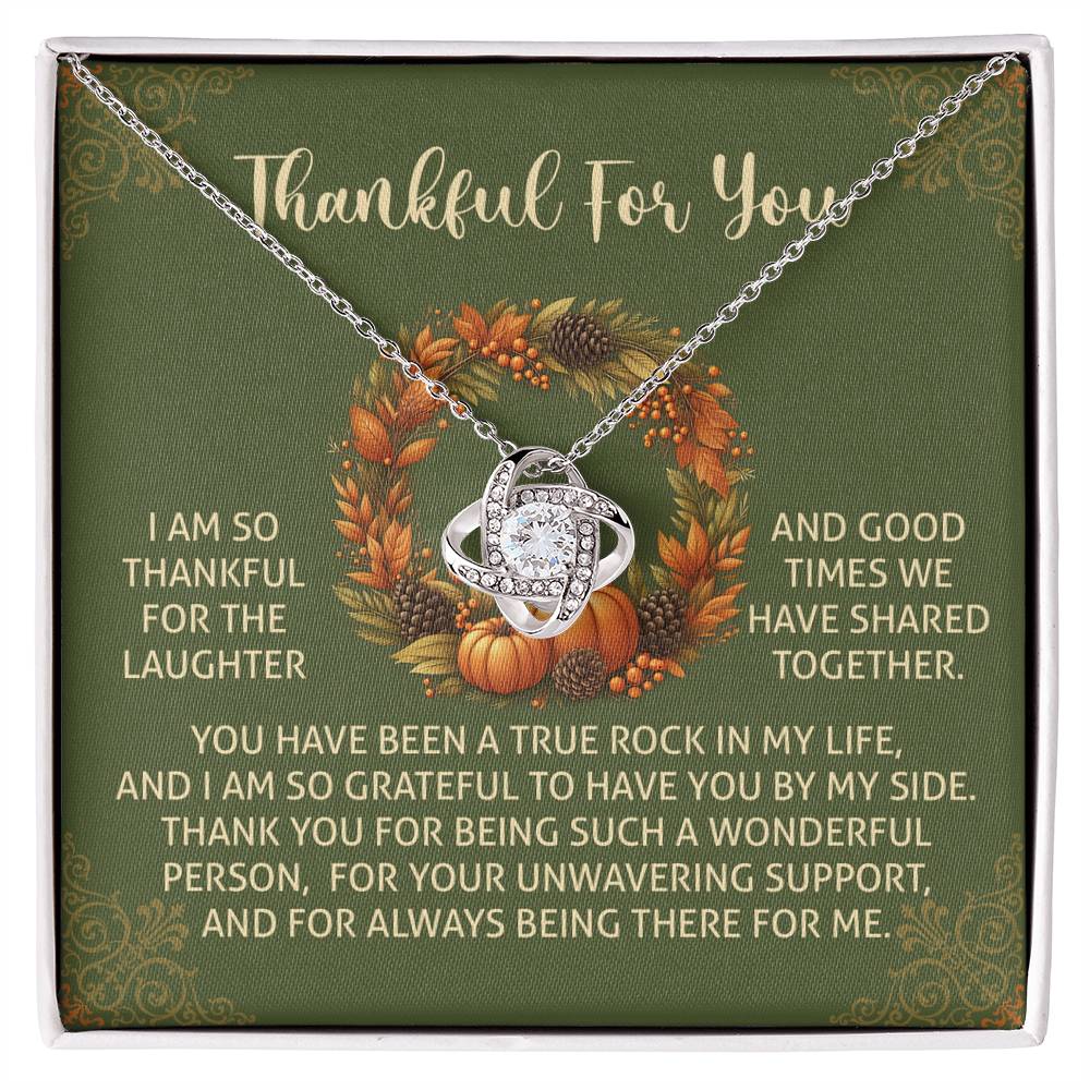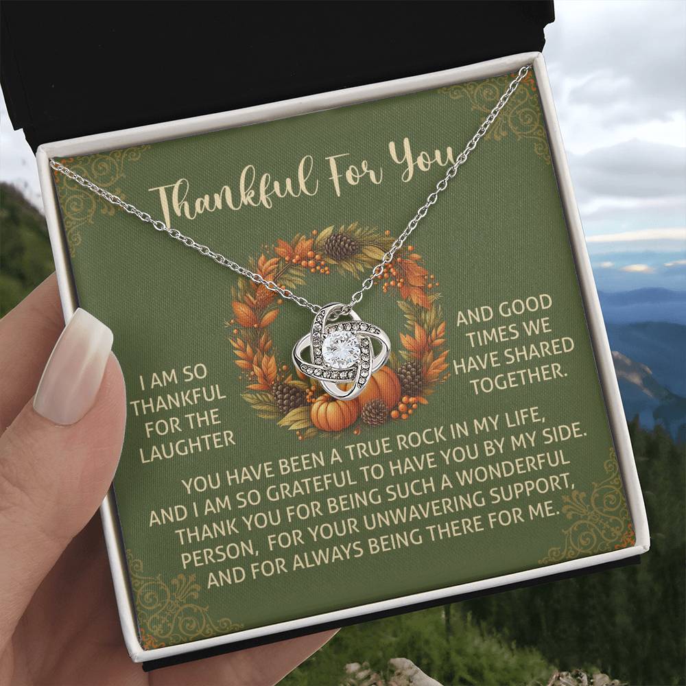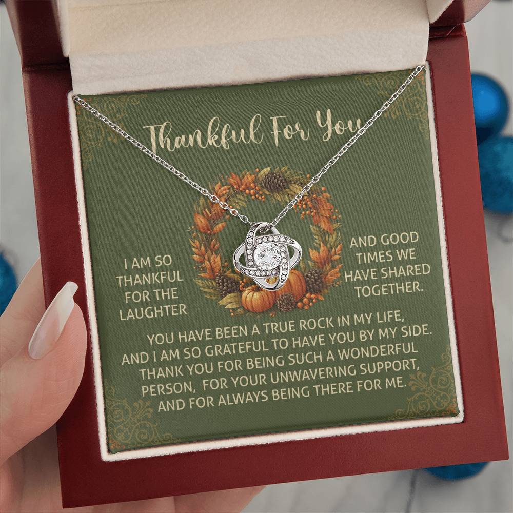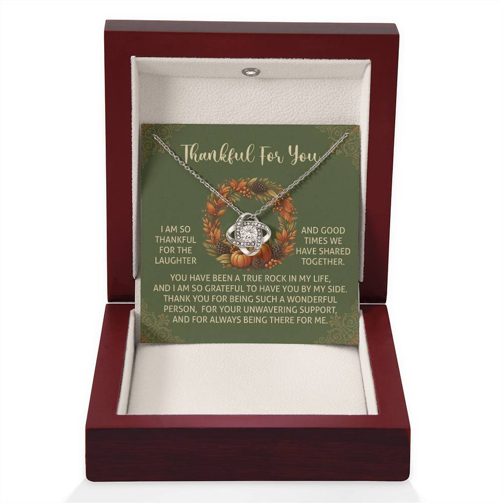 Your loved one, family member, or close friend will be overwhelmed with joy when she receives this Love Knot Necklace and your heartfelt "Thank You" message letting her know how much she means and is loved.