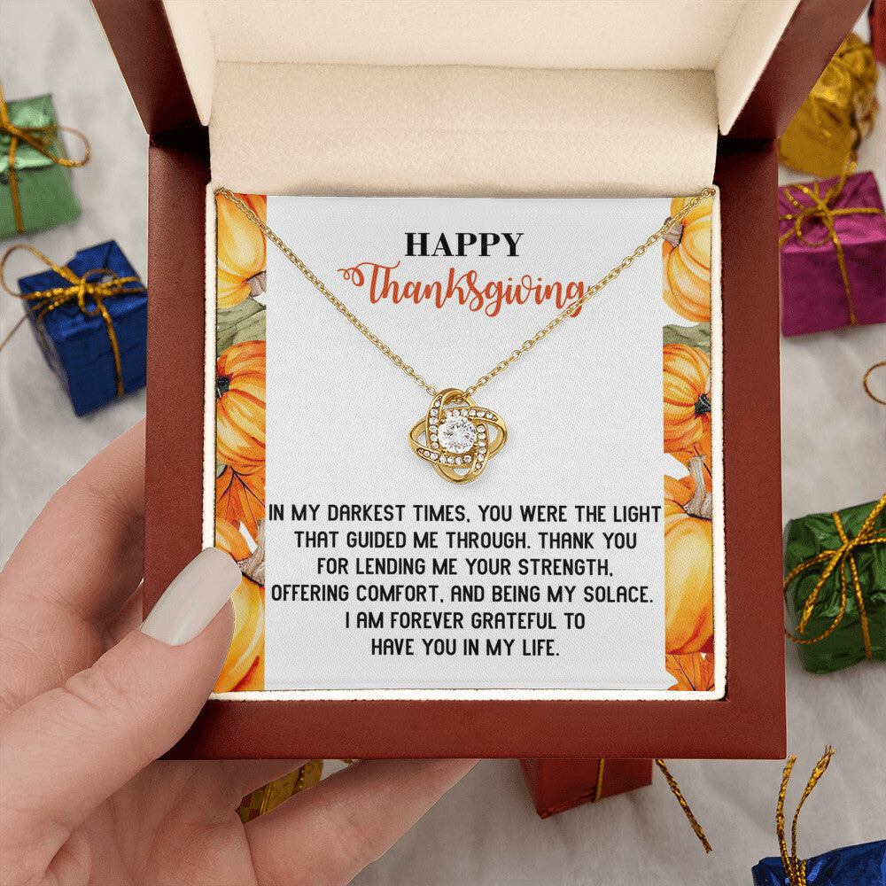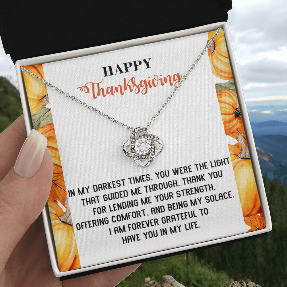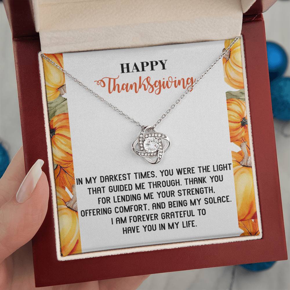 Your loved one, family member, or close friend will be overwhelmed with joy when she receives this Love Knot Necklace and your heartfelt "Thank You" message letting her know how much she means and is loved.