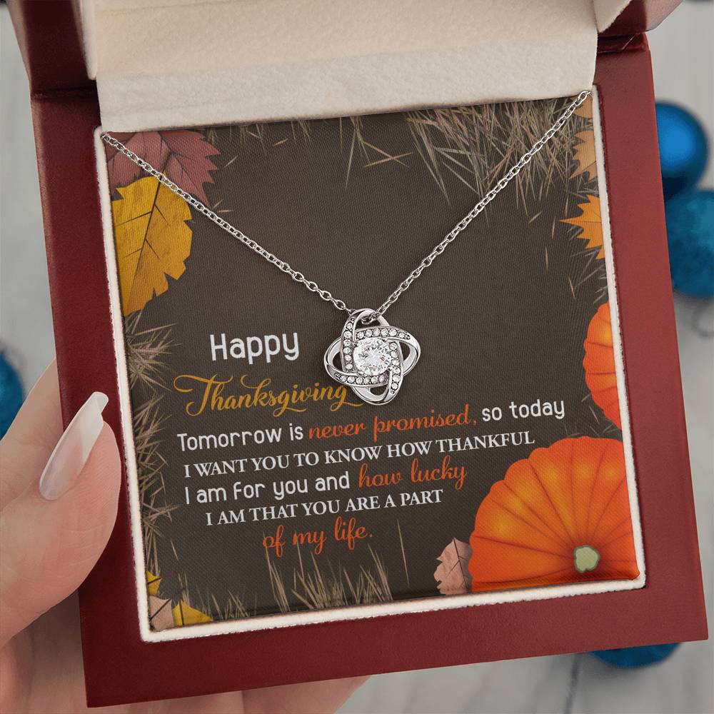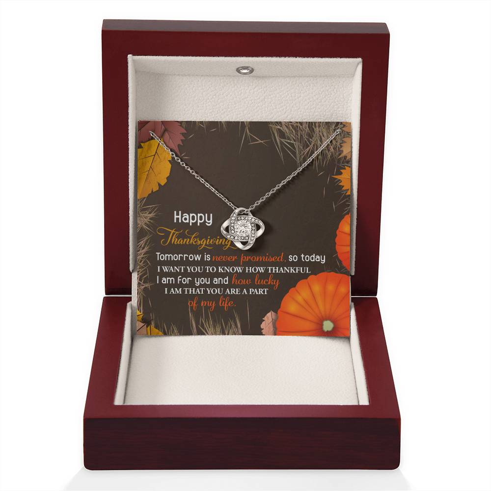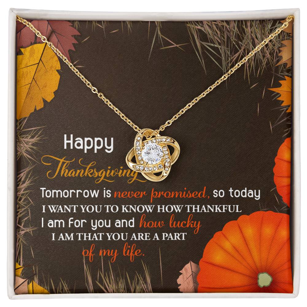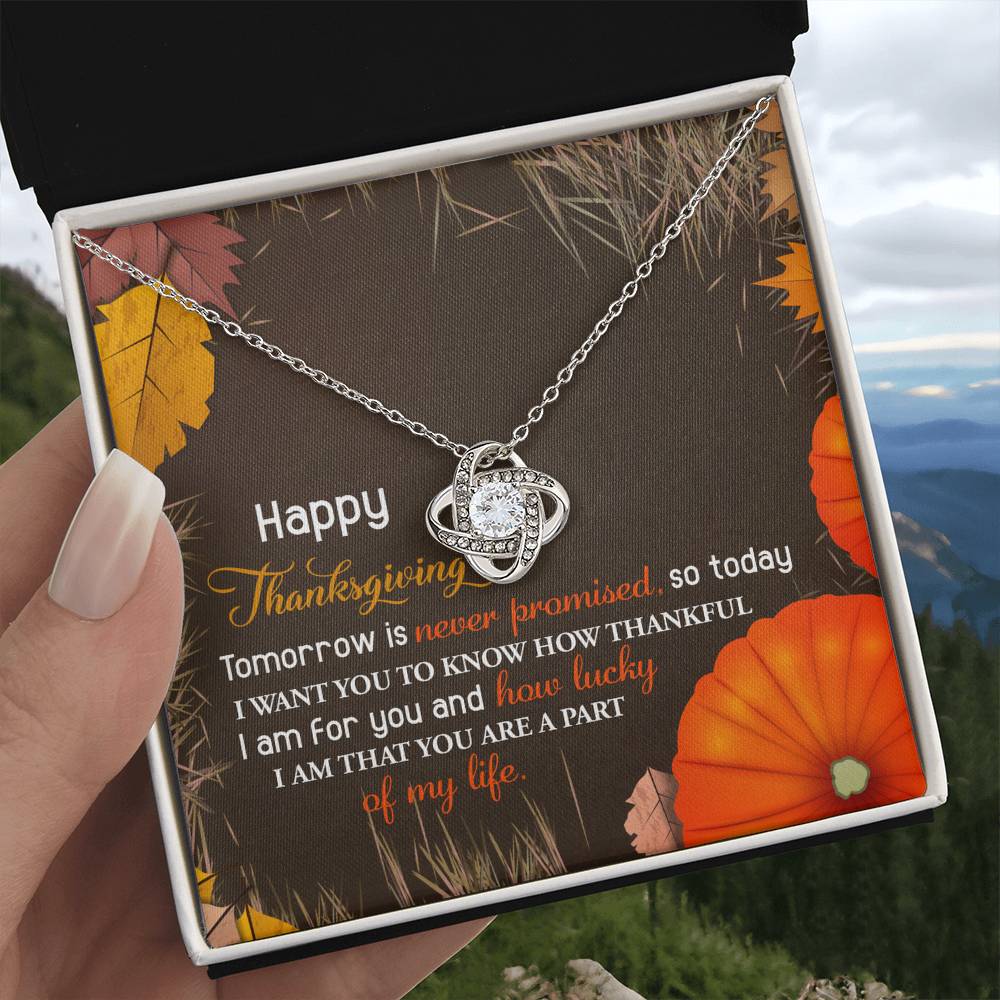 Your loved one, family member, or close friend will be overwhelmed with joy when she receives this Love Knot Necklace and your heartfelt "Thank You" message letting her know how much she means and is loved.