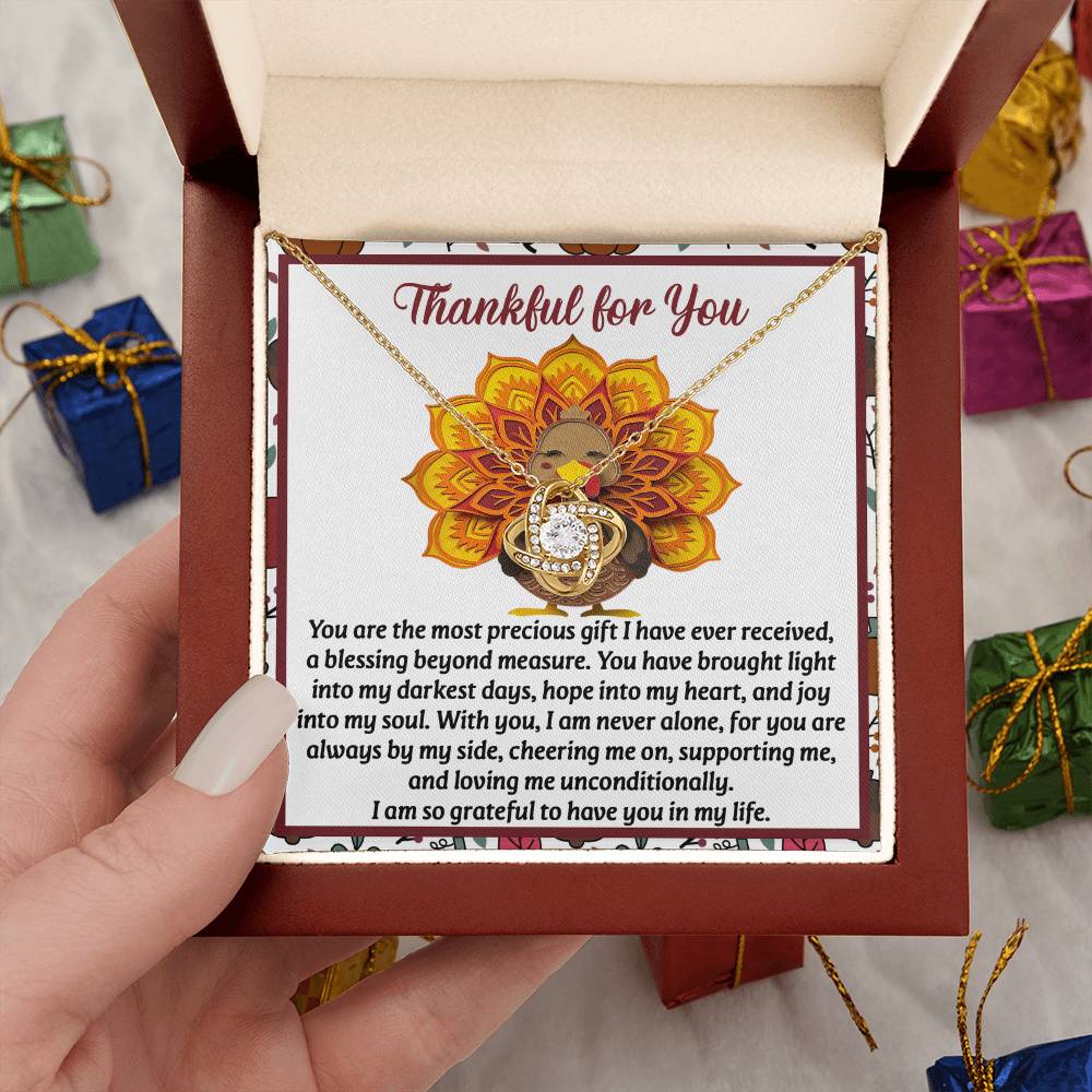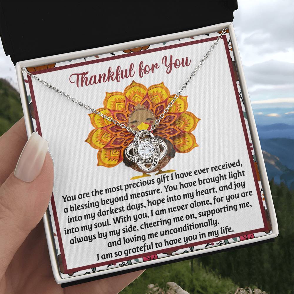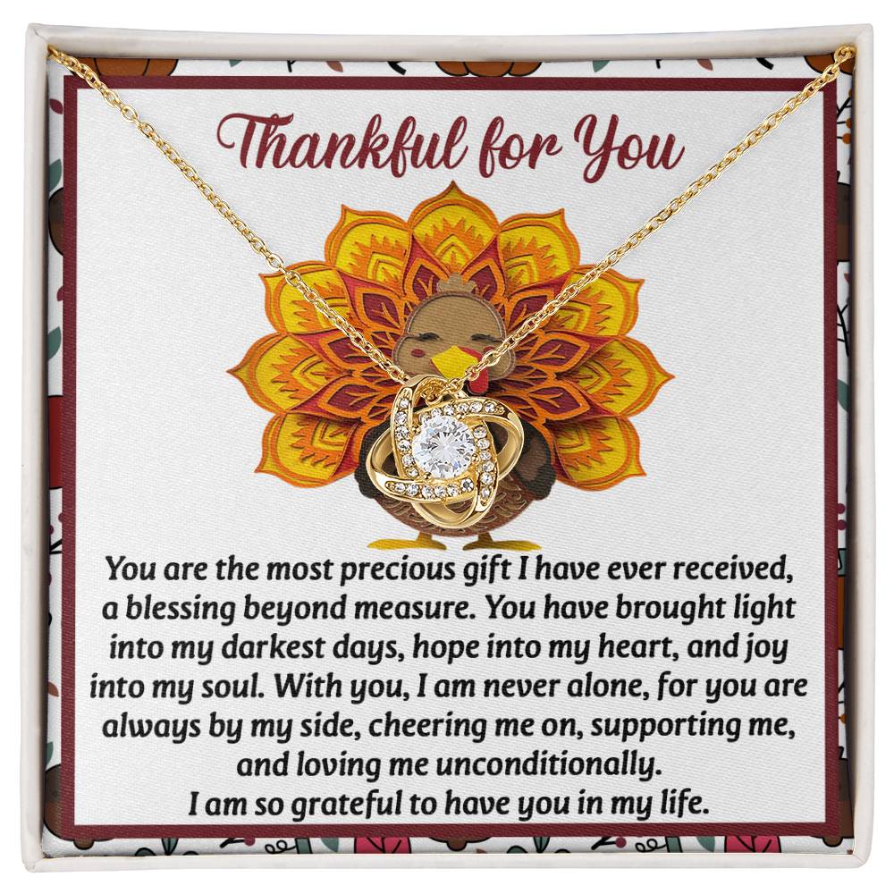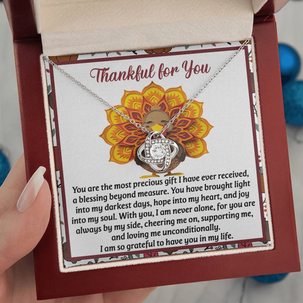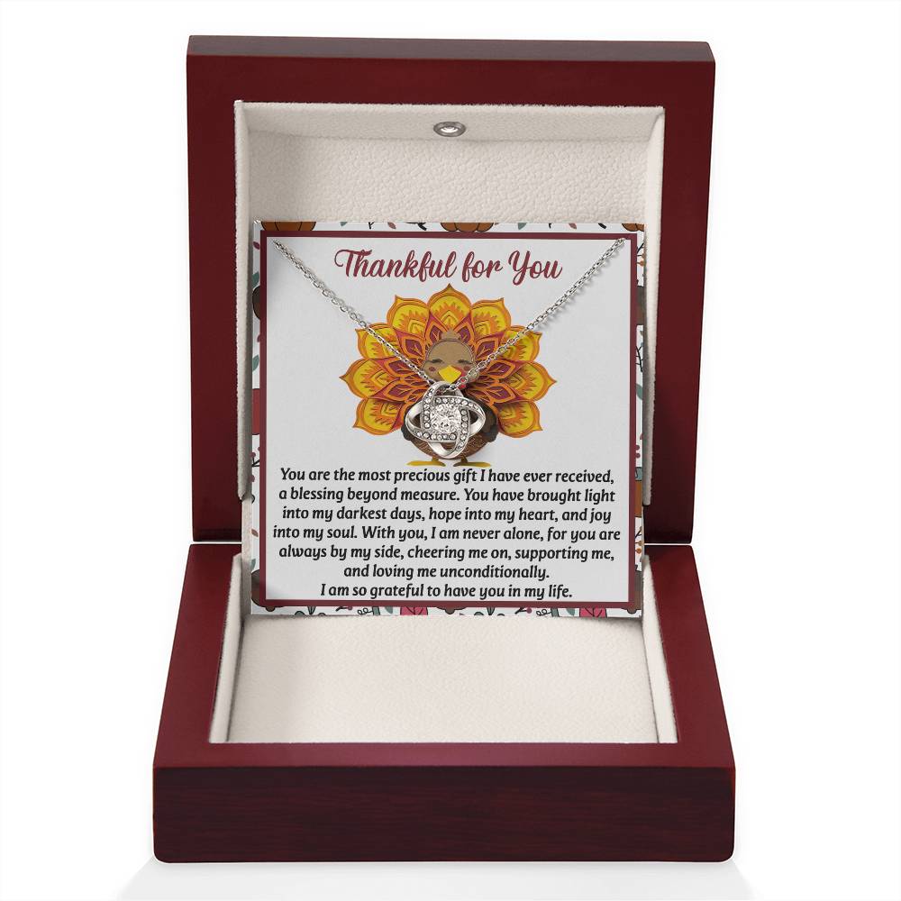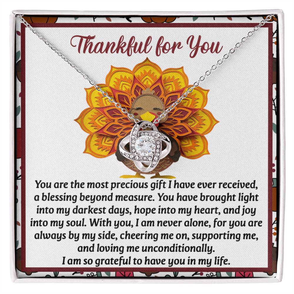 Your loved one, family member, or close friend will be overwhelmed with joy when she receives this Love Knot Necklace and your heartfelt "Thank You" message letting her know how much she means and is loved.