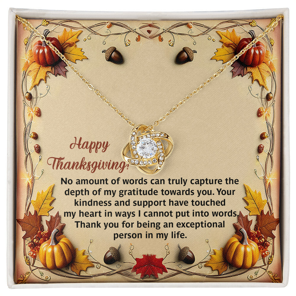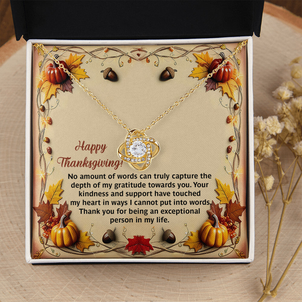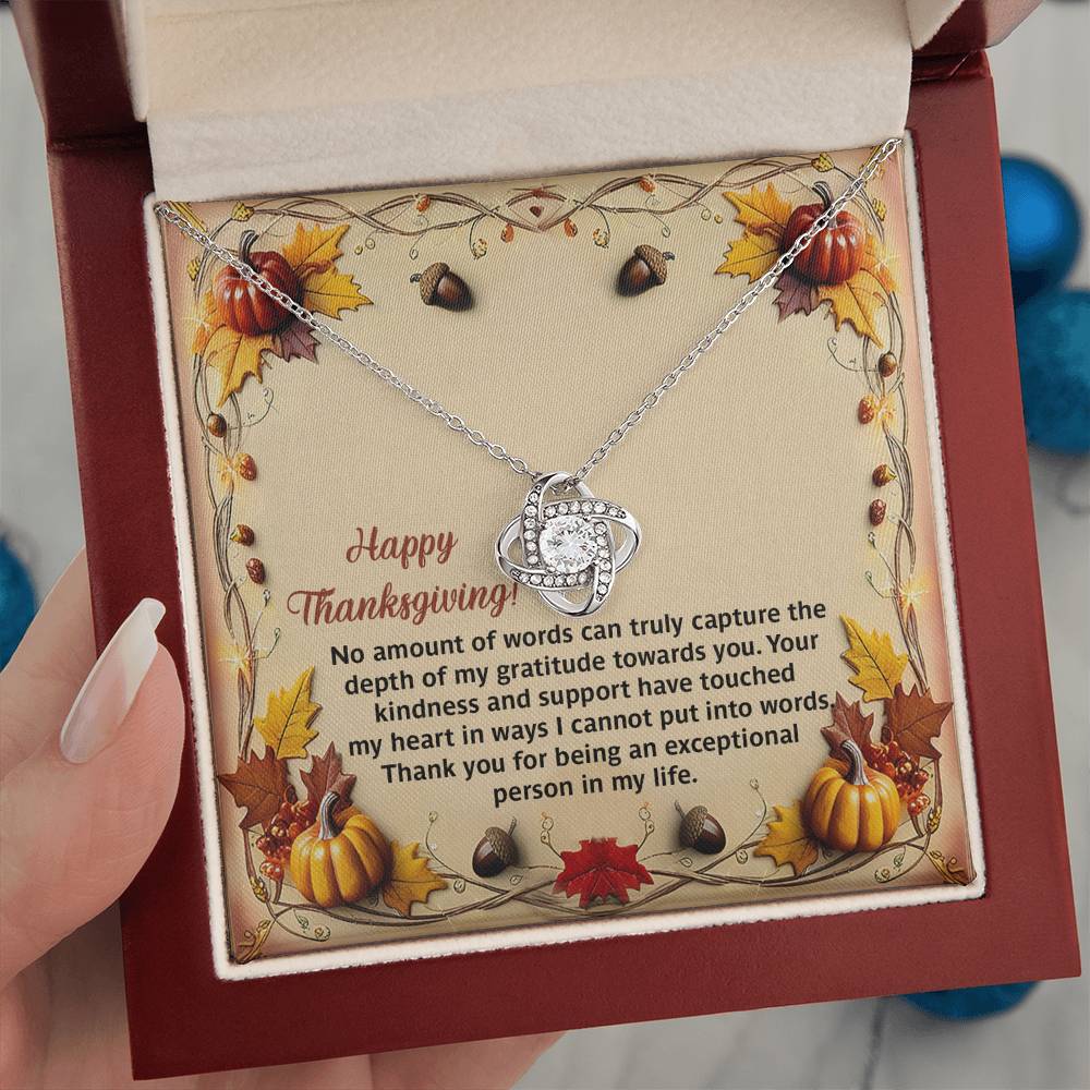 Your loved one, family member, or close friend will be overwhelmed with joy when she receives this Love Knot Necklace and your heartfelt "Thank You" message letting her know how much she means and is loved.