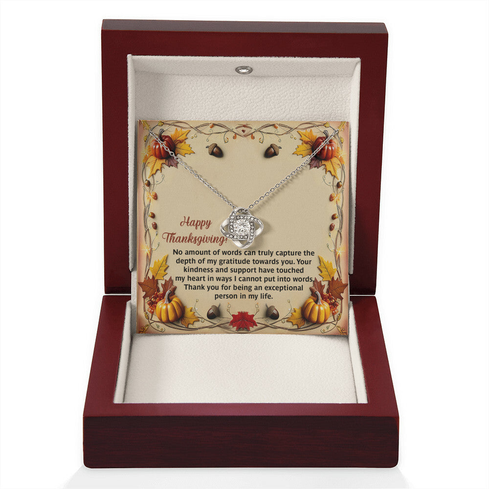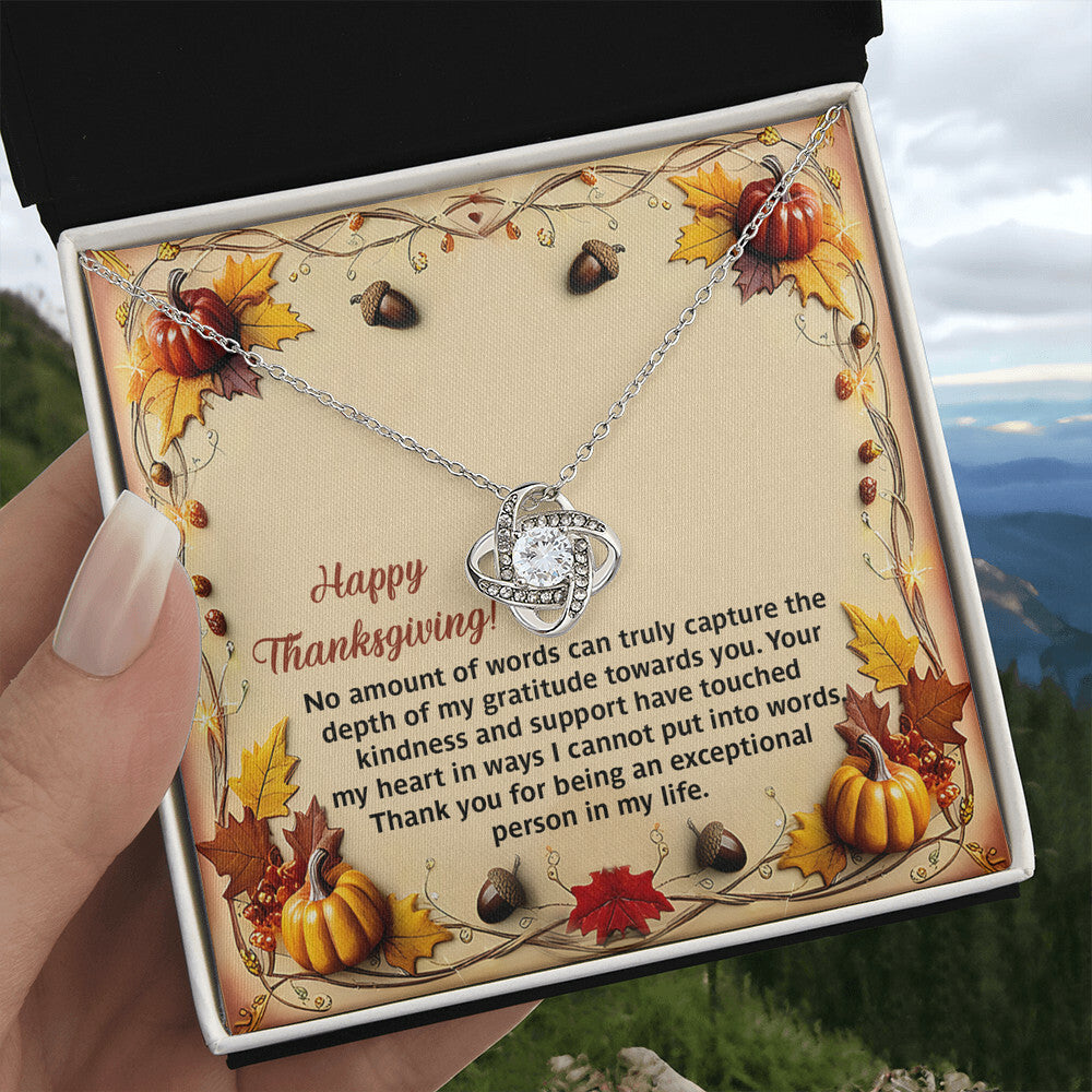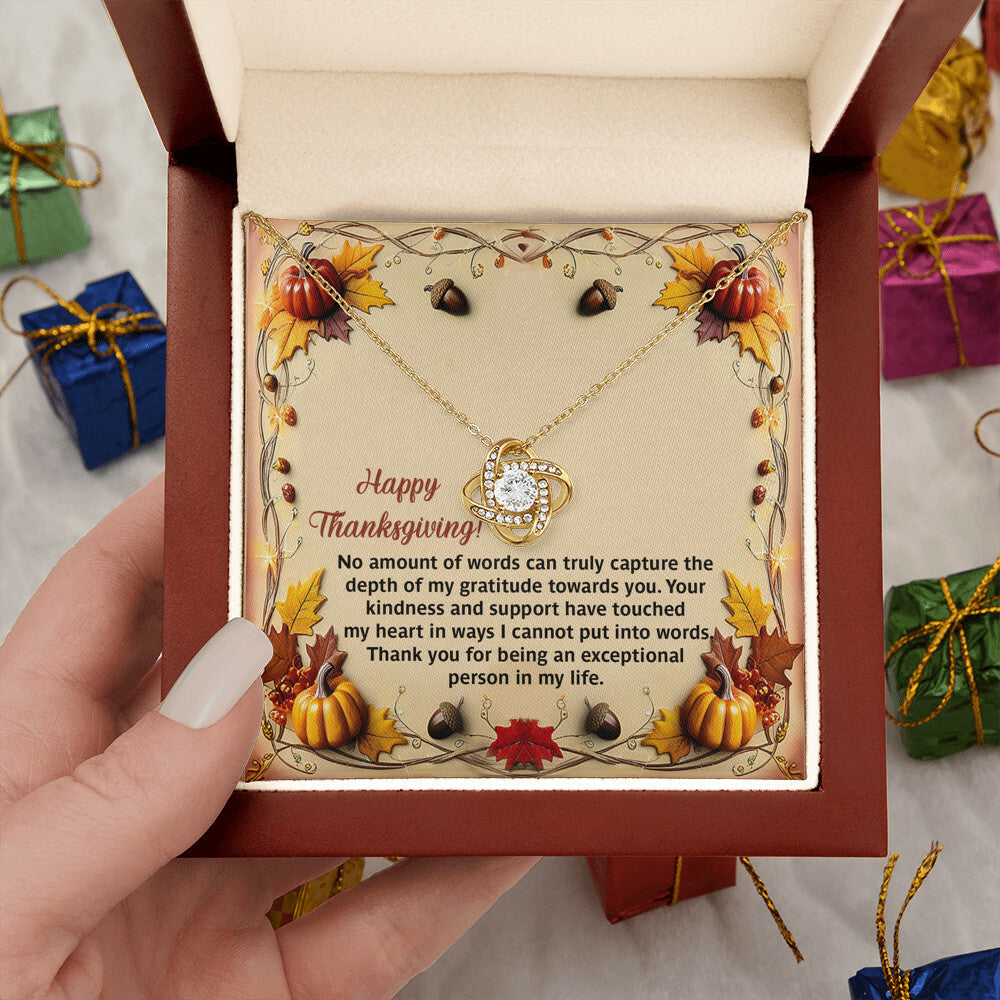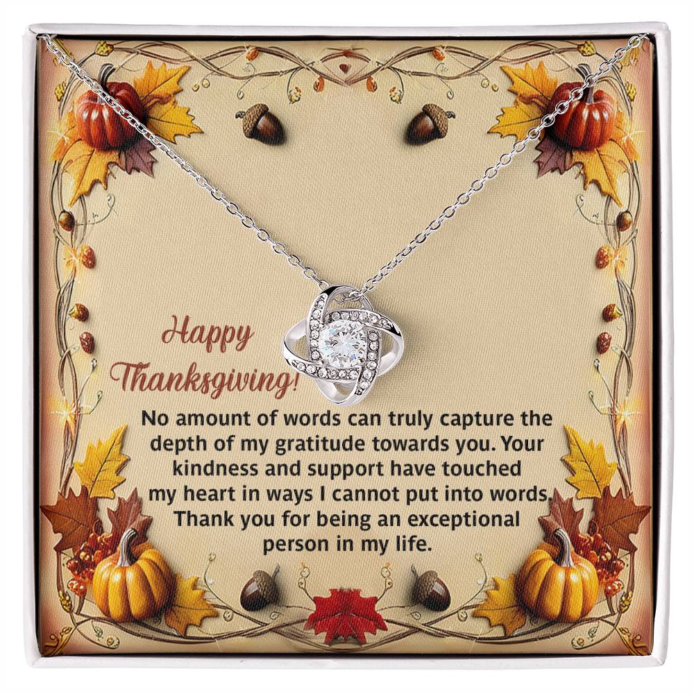 Your loved one, family member, or close friend will be overwhelmed with joy when she receives this Love Knot Necklace and your heartfelt "Thank You" message letting her know how much she means and is loved.