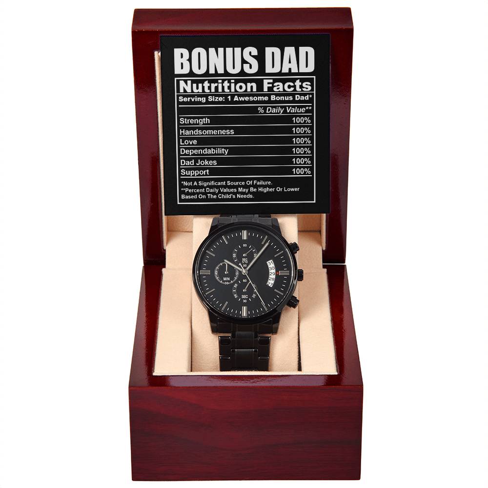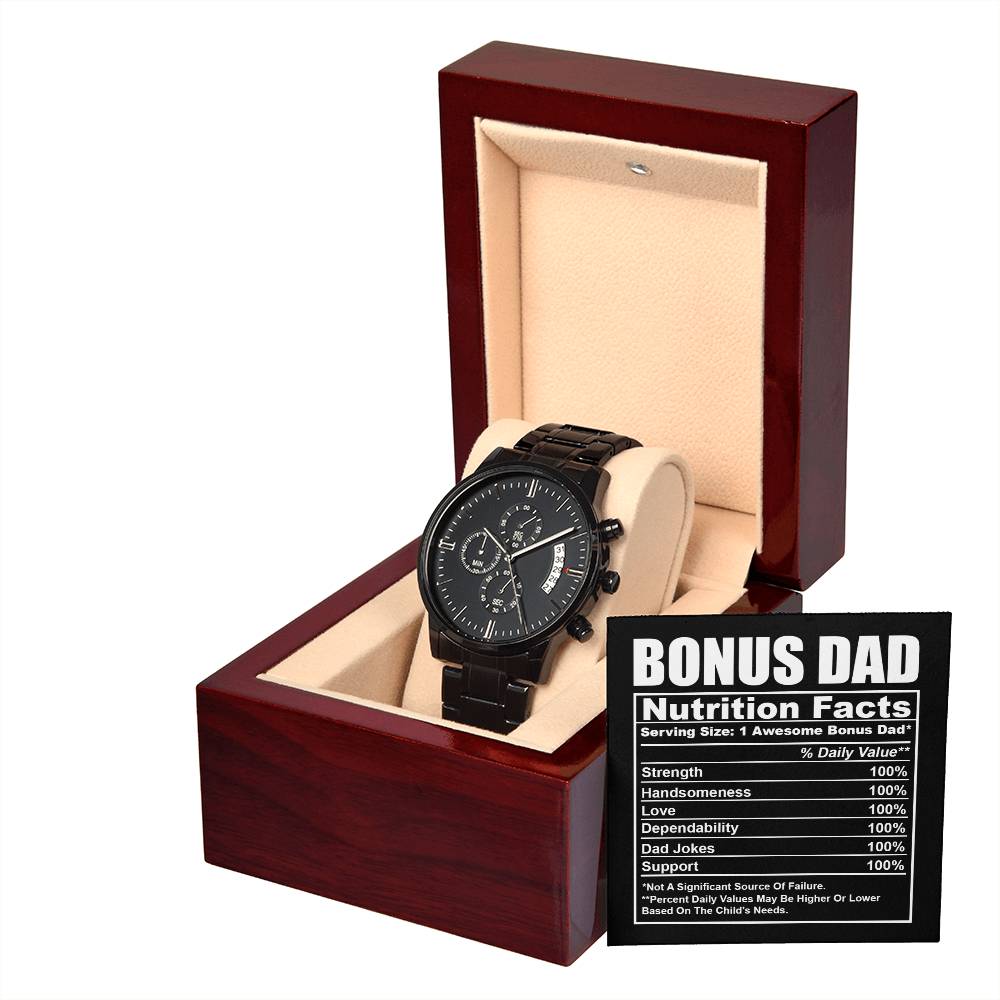 Bonus Dad Gift - Mens Black Wrist Watch with Mahogany Box and Message Card -Nutrition Facts