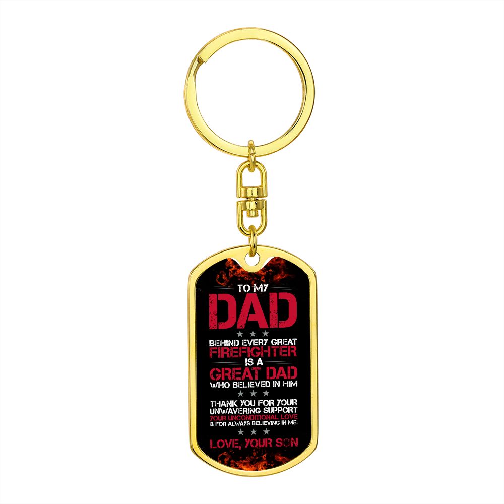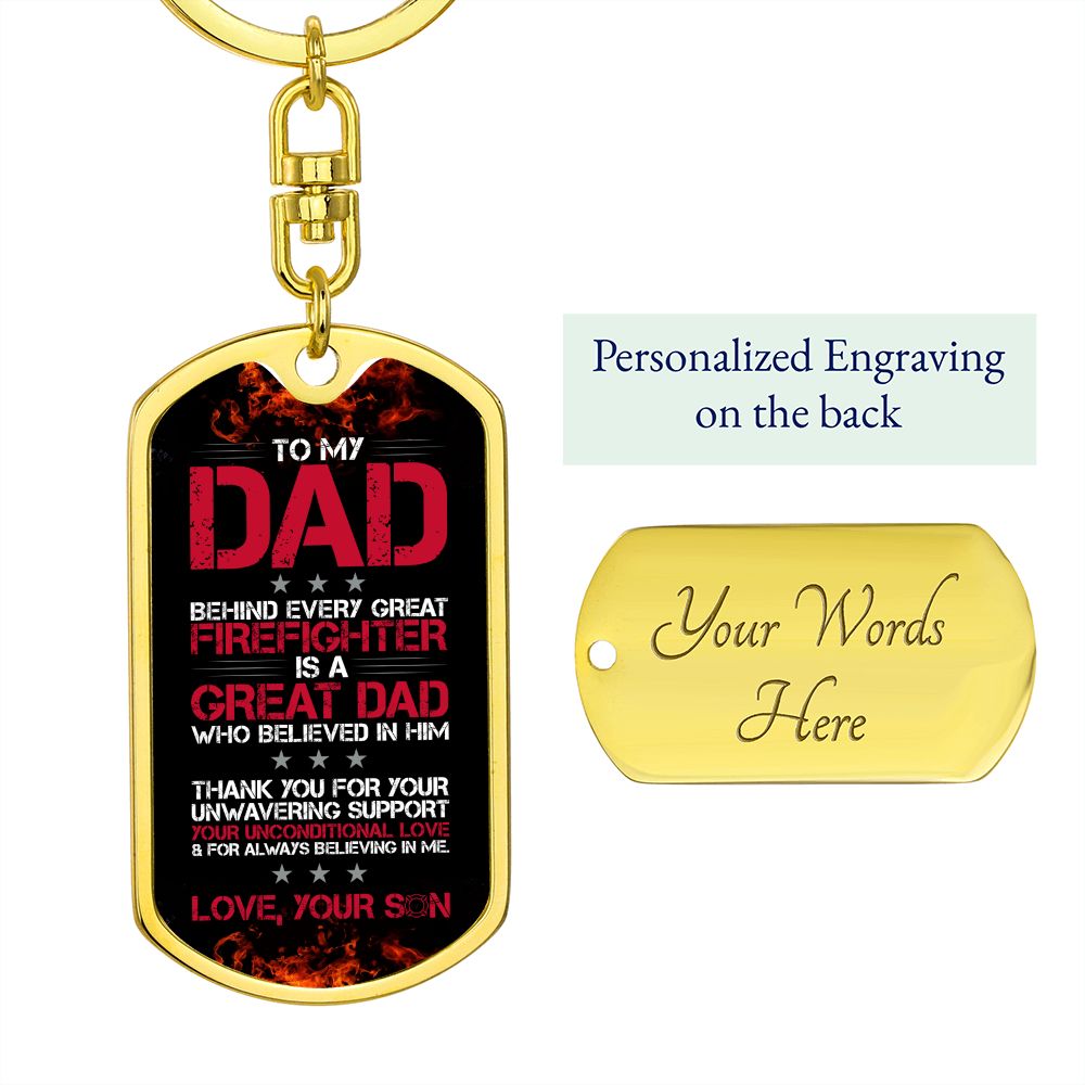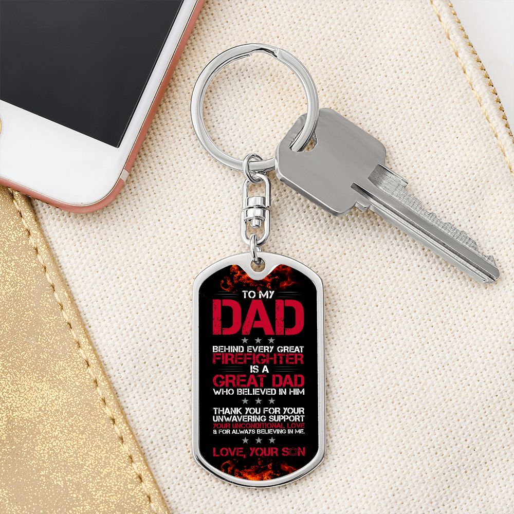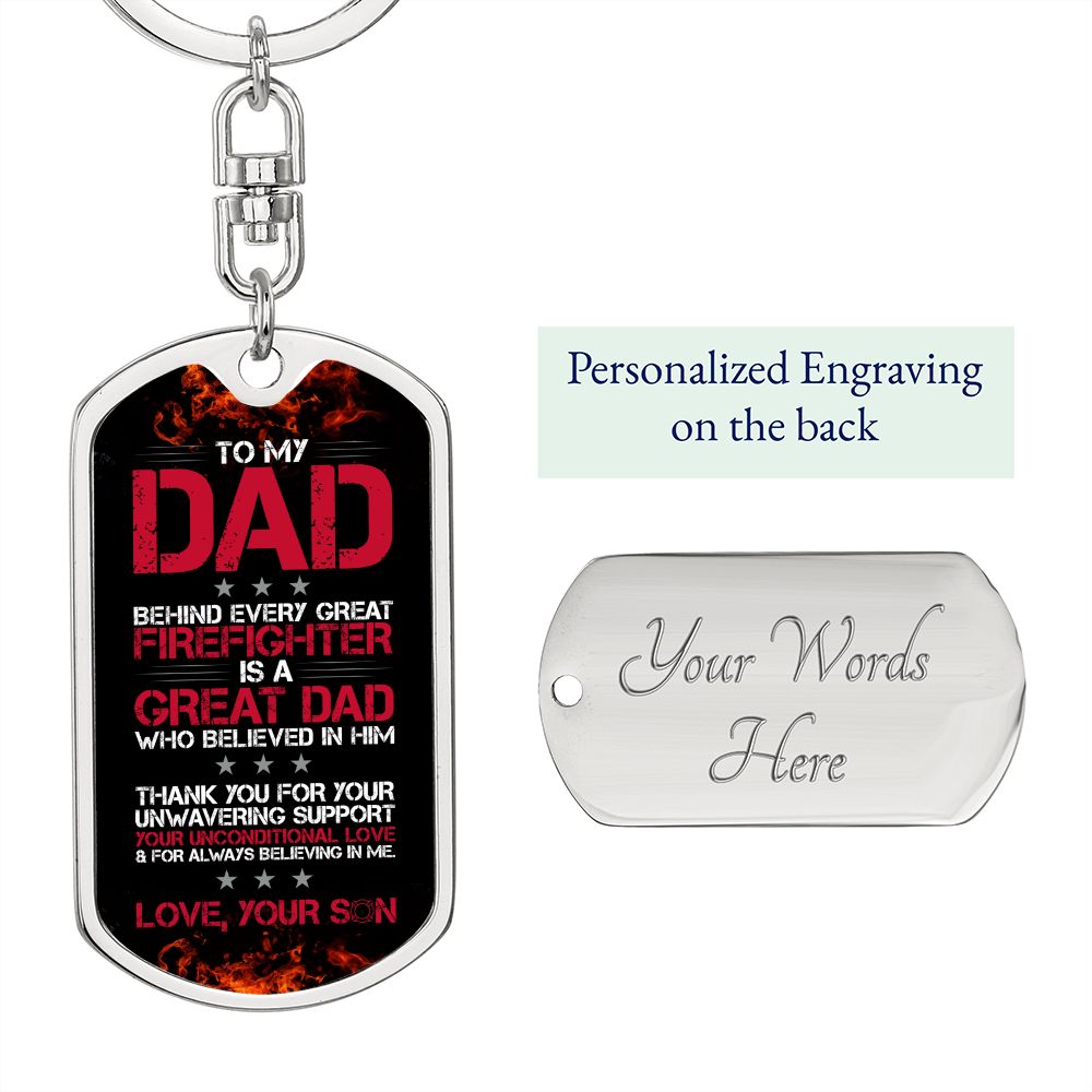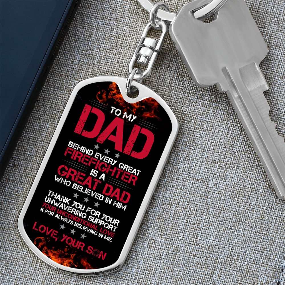 Dad Gift From Son- Dog Tag Swivel Keychain - Behind Every Great Firefighter Is A Great Dad