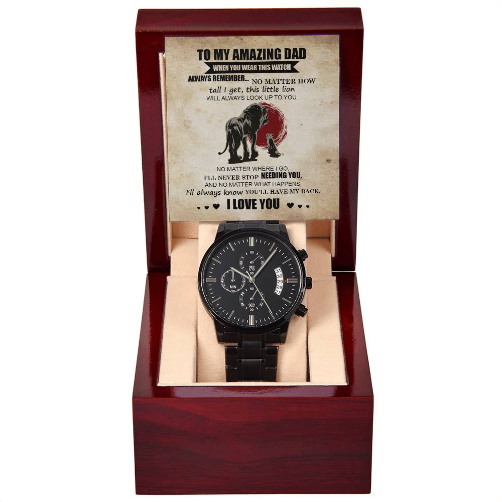 Gift For Dad - Mens Black Wrist Watch with Mahogany Box and Message Card - This Little Lion