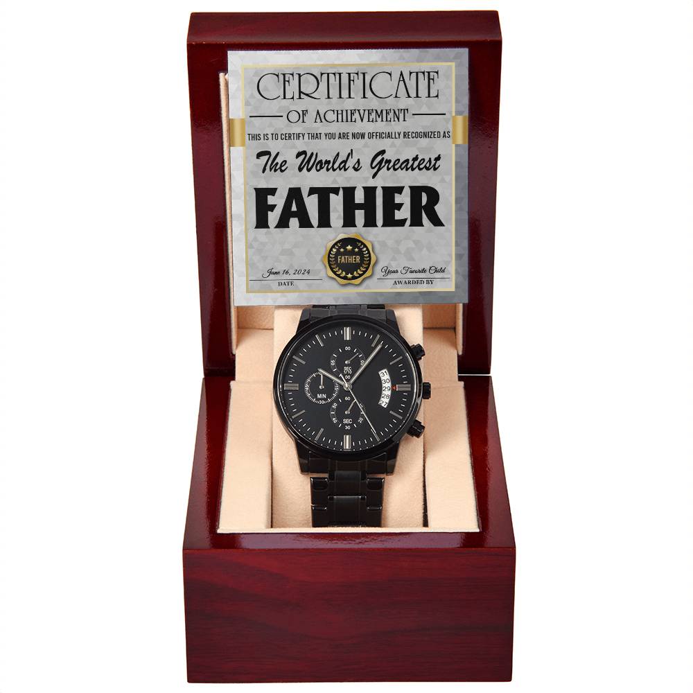 Gift For Dad - Mens Black Wrist Watch with Mahogany Box and Message Card - Worlds Greatest Father Certificate