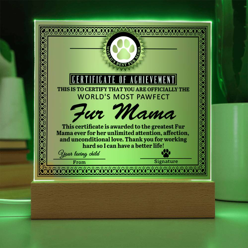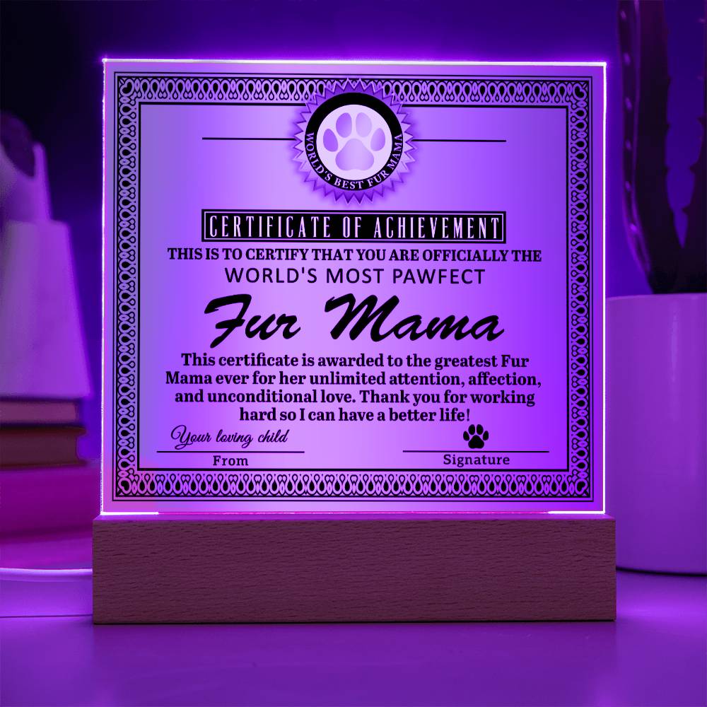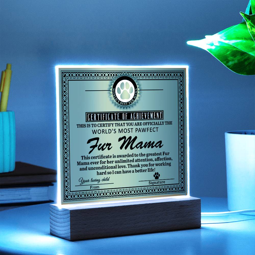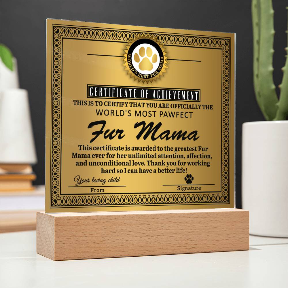 Fur Mama Gift -Certificate of Achievement - Acrylic Square Plaque