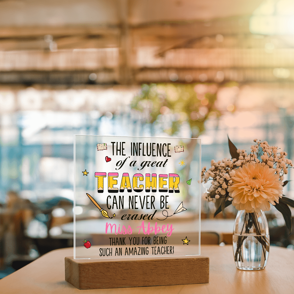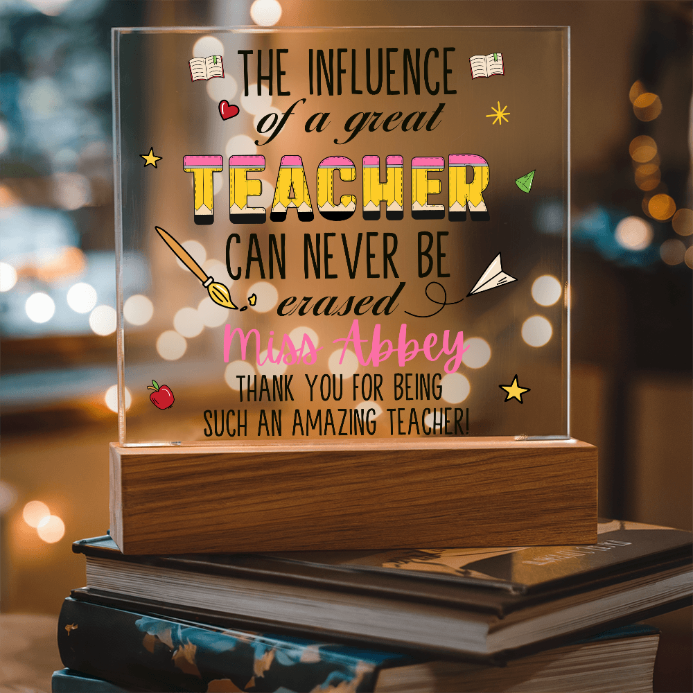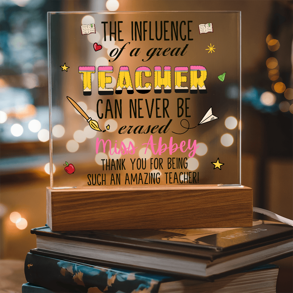 Your plaque will be crafted from premium acrylic with a professionally printed design for a polished look. It comes with a stylish wooden LED base, and you can choose between a USB plug-in option OR a cordless battery-operated option (requires 2 AAA batteries, not included). Both LED bases feature 7 vibrant colors, allowing the user to customize the lighting with various color changes and dynamic cycles.