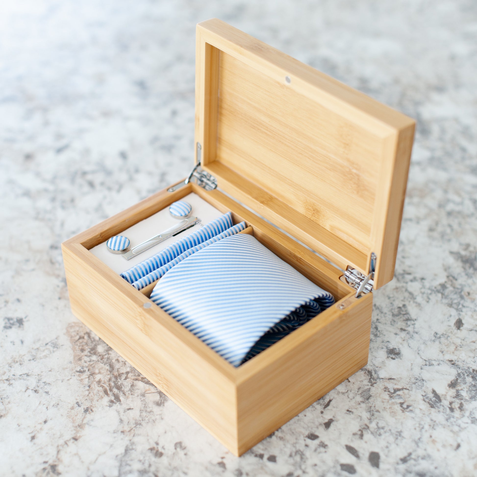 Make a lasting impression with the Bamboo Tie Box—a beautifully crafted keepsake that turns any gift into a standout moment. Designed with elegance and functionality in mind, this box is made from real bamboo and finished with a striking laser-engraved design on top. Its hinged lid opens to reveal a perfectly arranged set featuring a tie, matching handkerchief, cufflinks, and a sleek tie clip—ideal for groomsmen, Father’s Day, birthdays, or any special occasion.