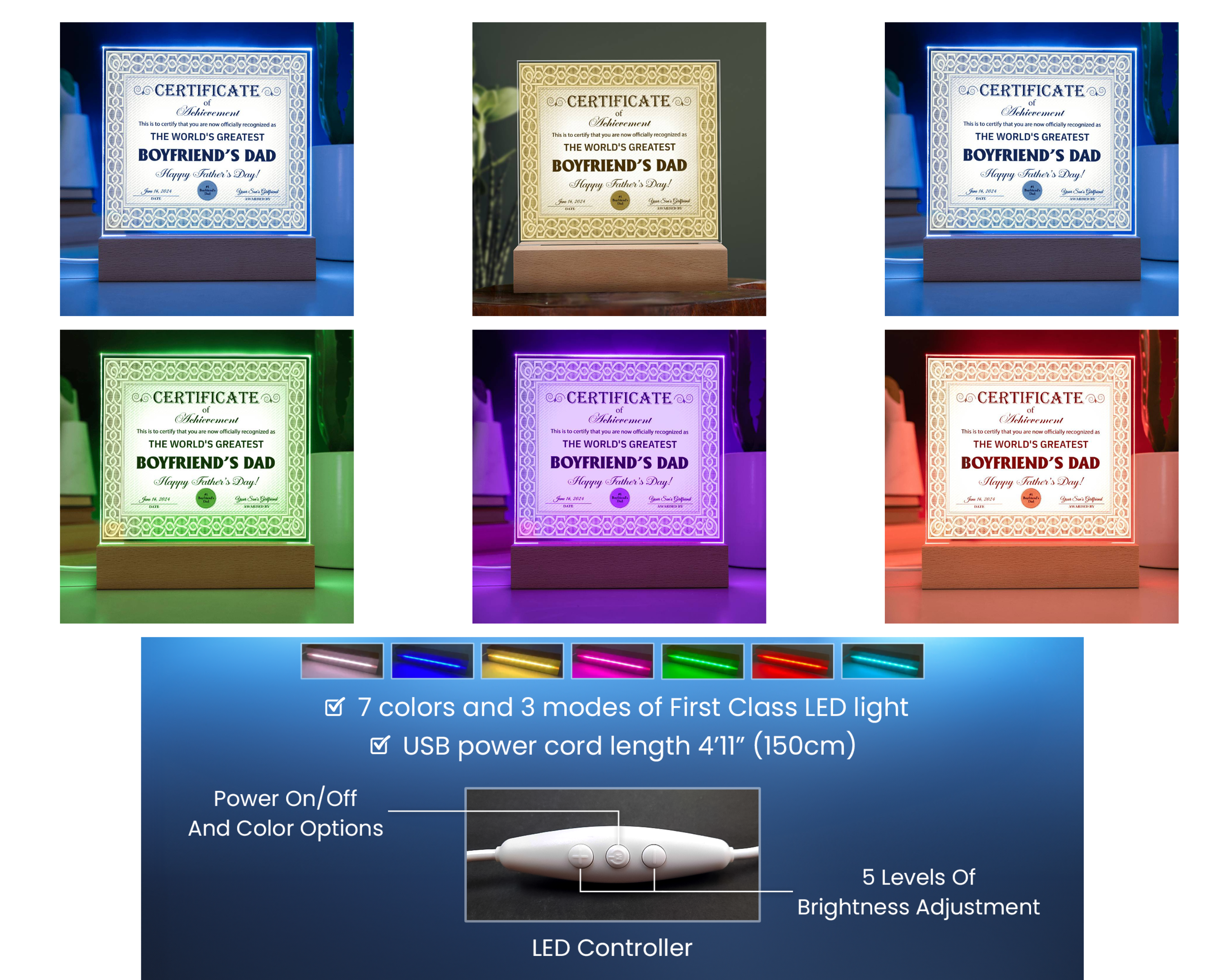 Create a memorable presentation when you upgrade to the LED wooden base with 7 colors, 3 modes, and a USB plug-in!