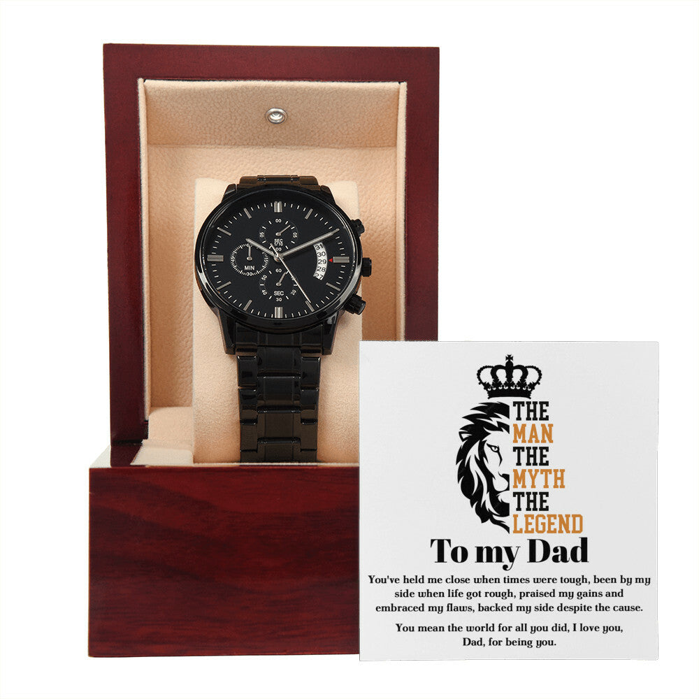 Gift For Dad - Mens Black Wrist Watch with Mahogany Box and Message Card - The Legend