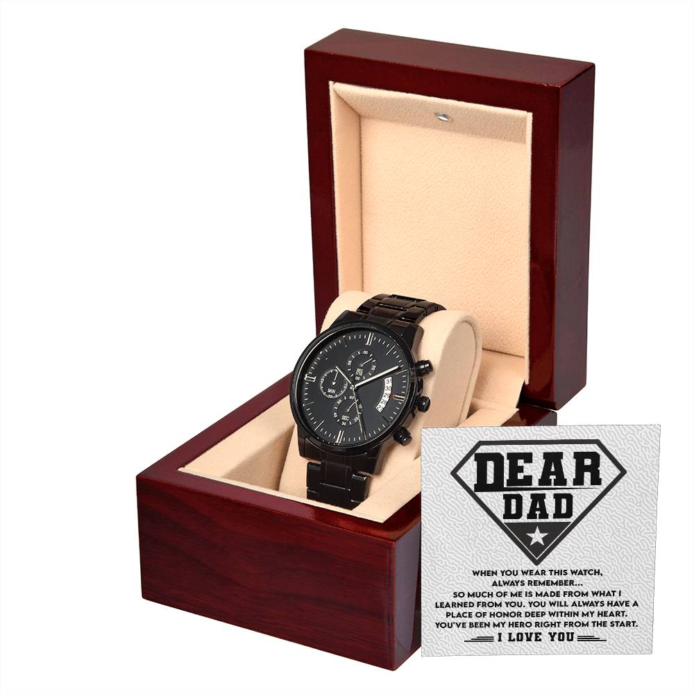 Dad Watch Gift - My Hero - Black Chronograph Watch with Mahogany Box