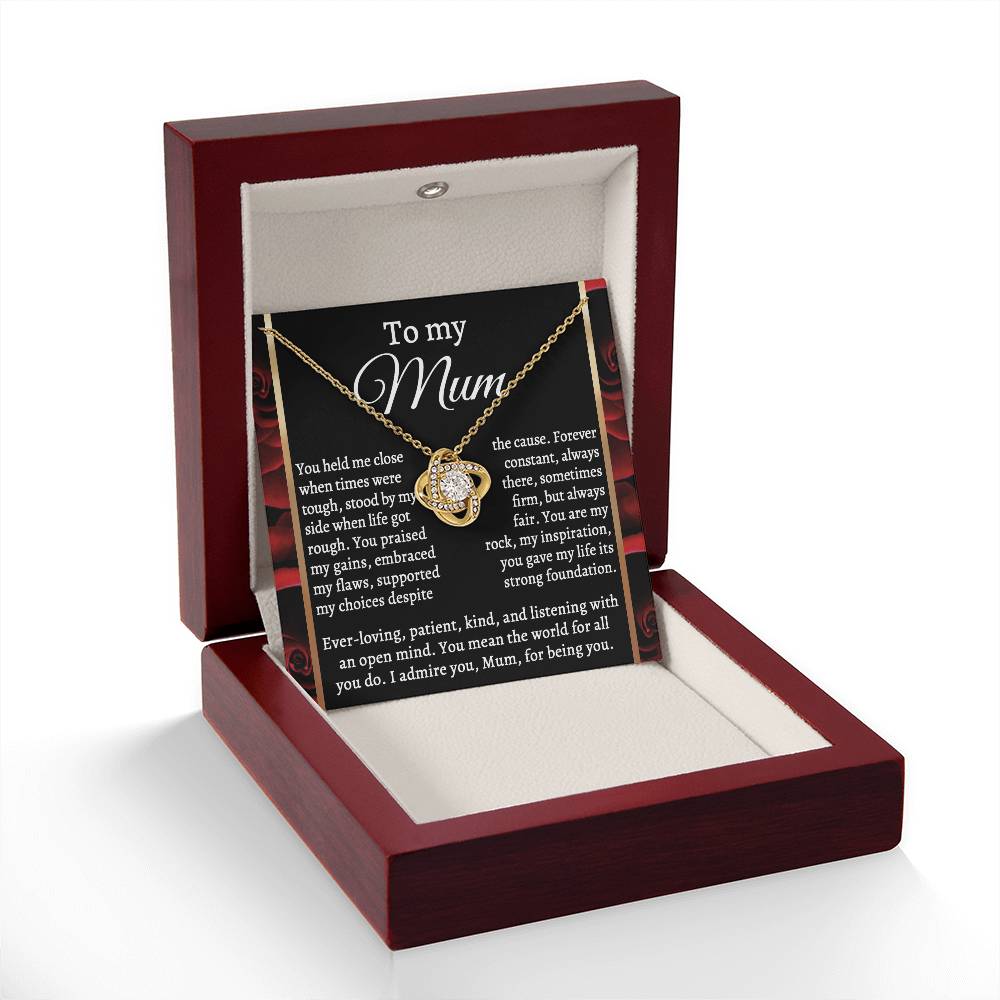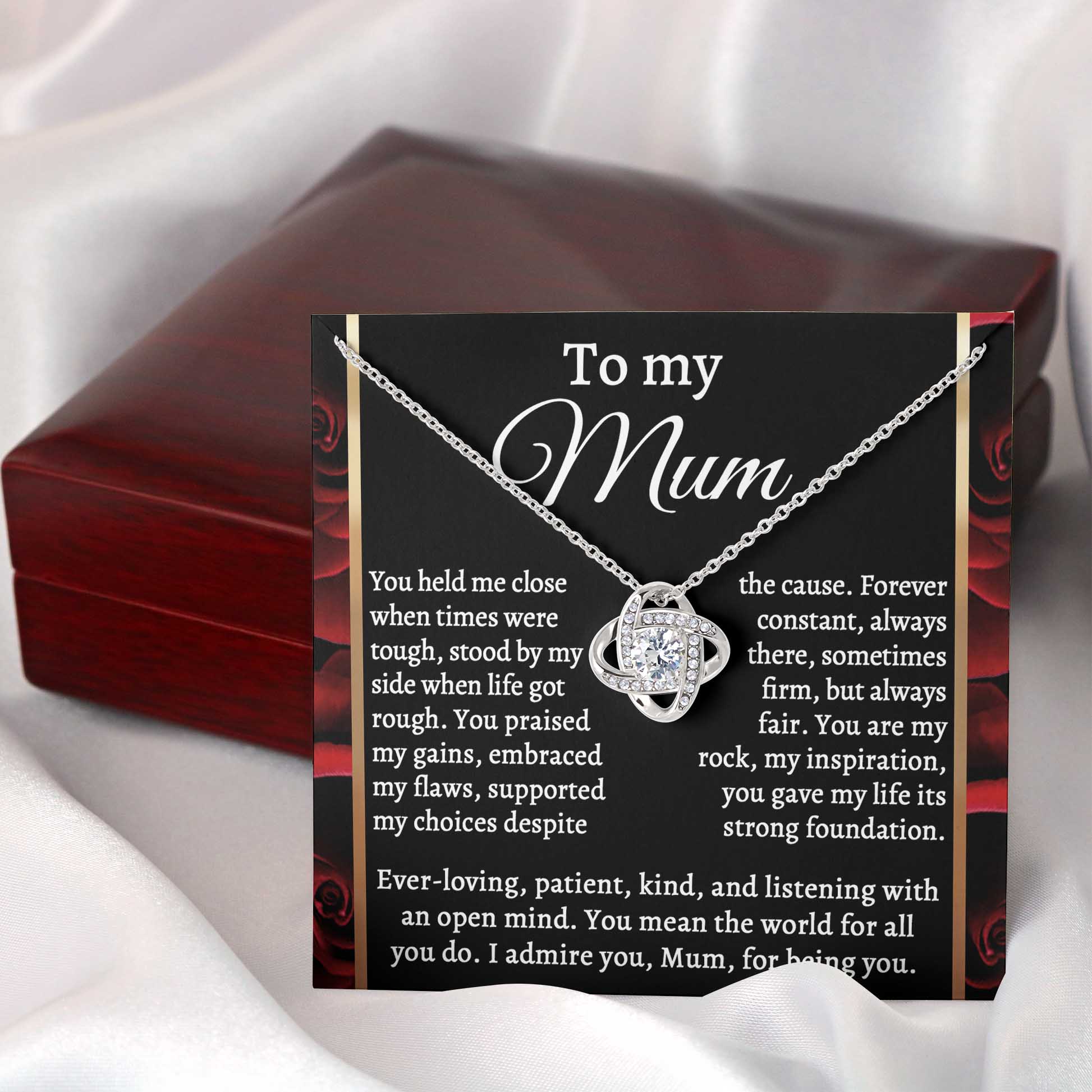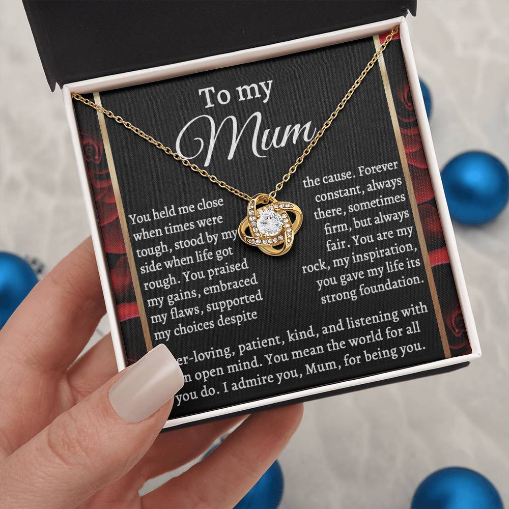 Surprise your Mother with this sparkling Love Knot necklace and your heartfelt message letting her know how much she means and how much you love her.