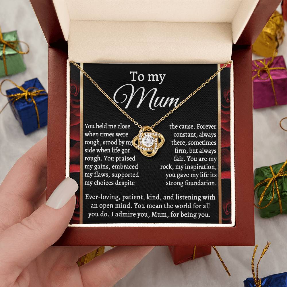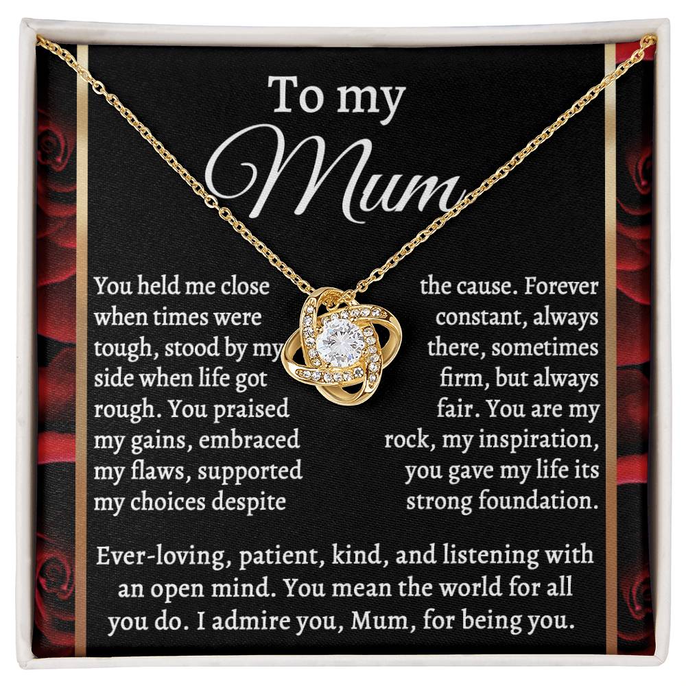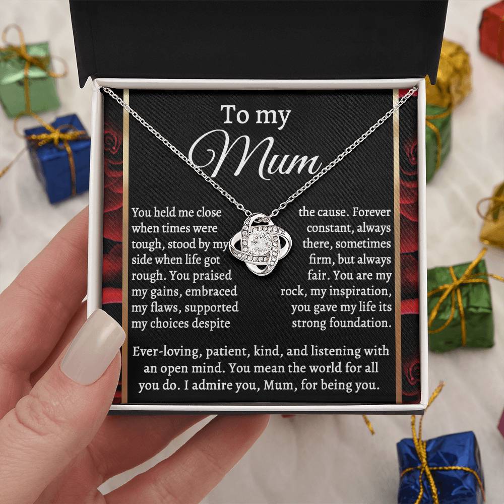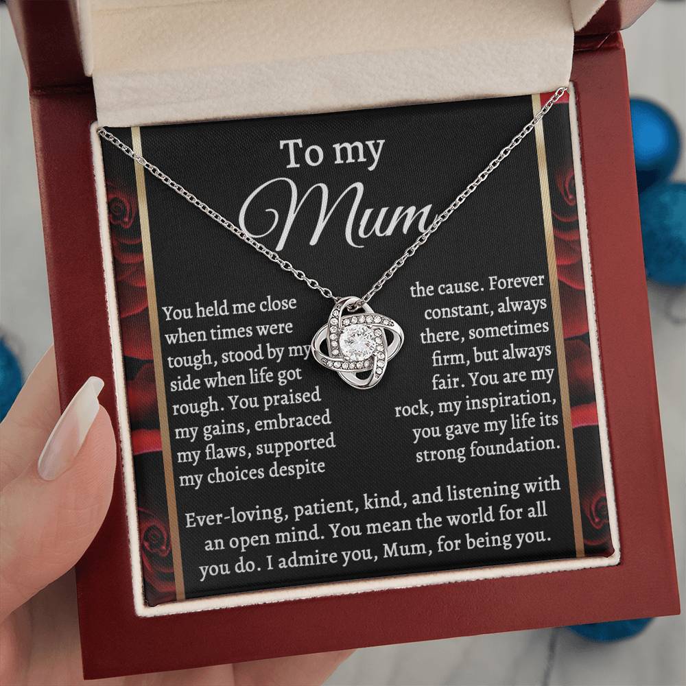 Surprise your Mother with this sparkling Love Knot necklace and your heartfelt message letting her know how much she means and how much you love her.