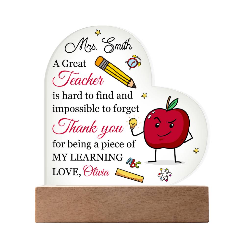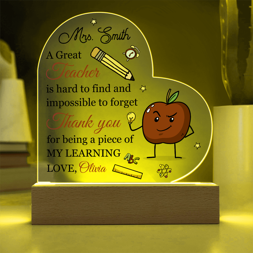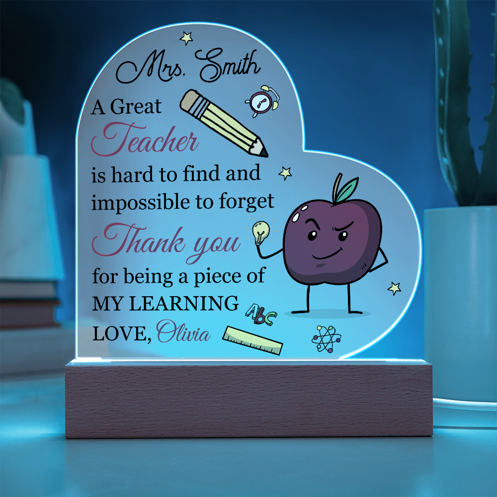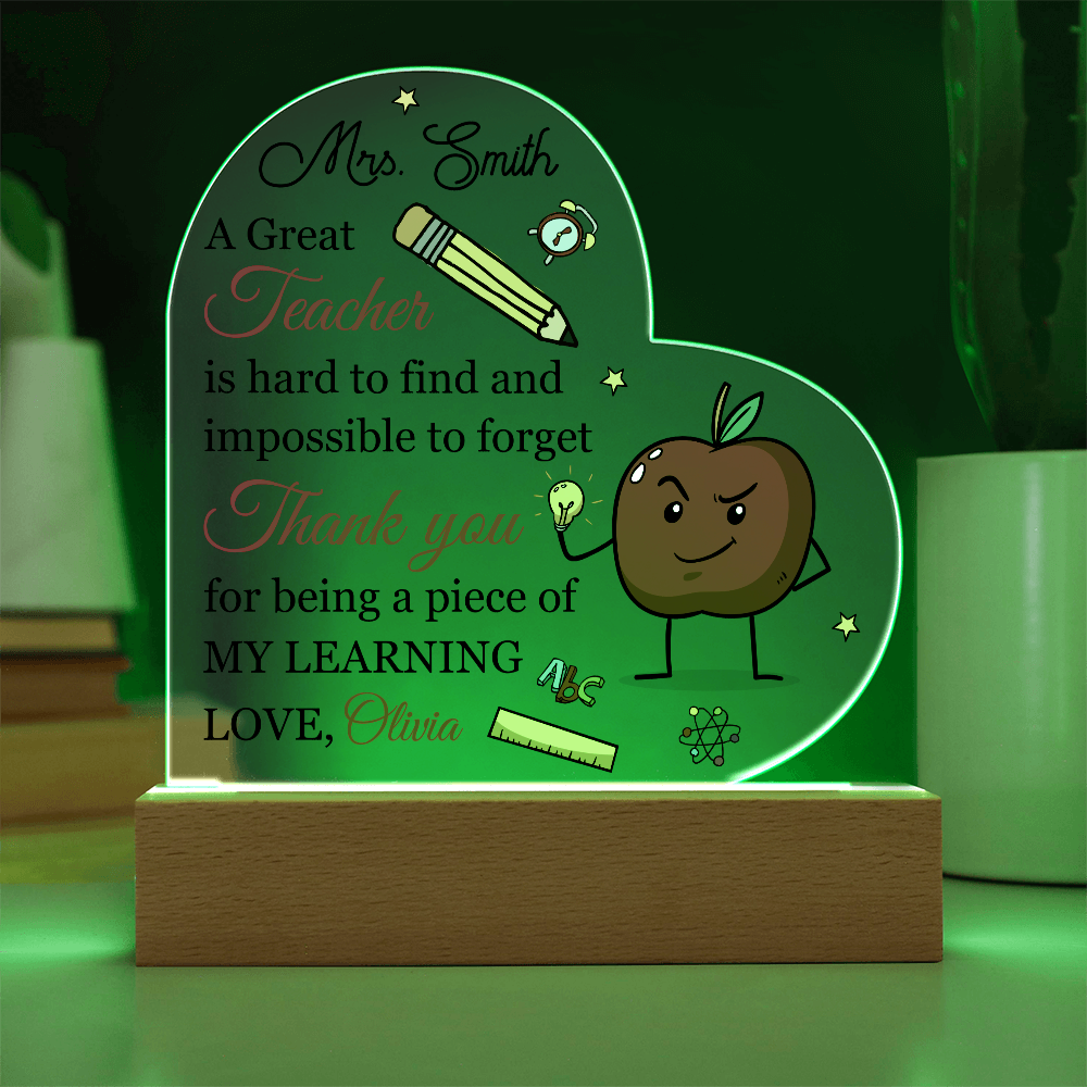 Your plaque will be crafted from premium acrylic with a professionally printed design for a polished look. It comes with a stylish wooden LED base, and you can choose between a USB plug-in option OR a cordless battery-operated option (requires 2 AAA batteries, not included). Both LED bases feature 7 vibrant colors, allowing the user to customize the lighting with various color changes and dynamic cycles.