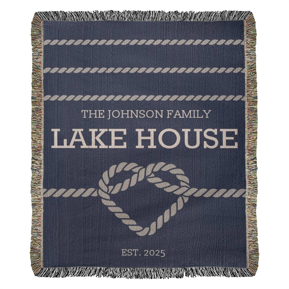 Personalized Woven Blanket for Lake House Owner - Family Name Lake House with Heart Rope