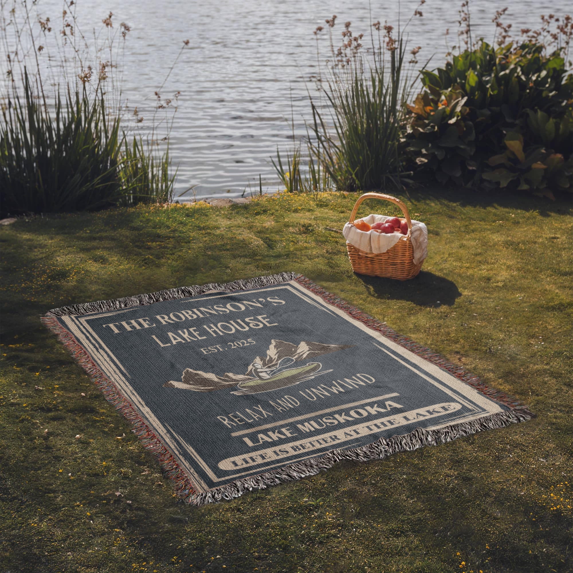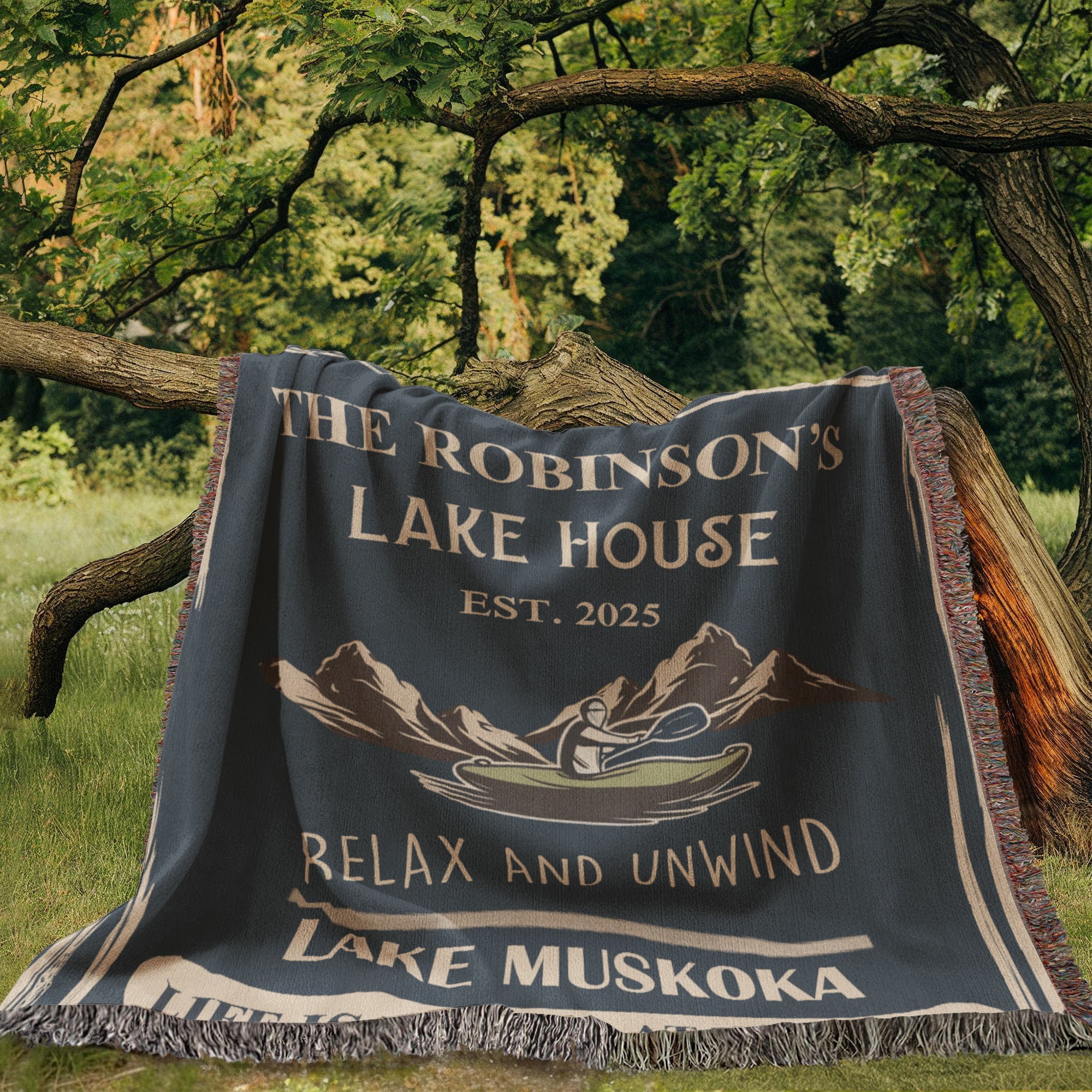 Personalized Woven Blanket for Lake House Owner - Family Name Lake House - Relax and Unwind