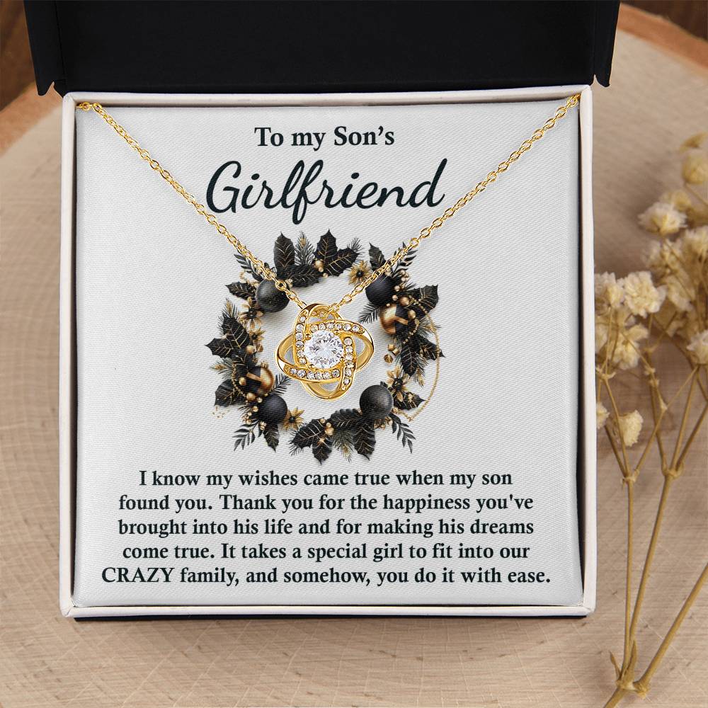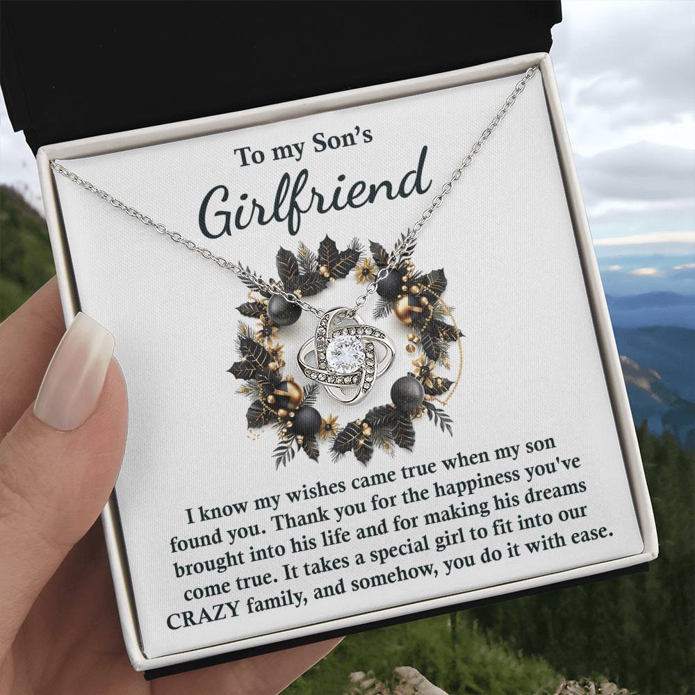 Surprise your son's girlfriend with this stunning Love Knot necklace along with your loving and heartfelt message.