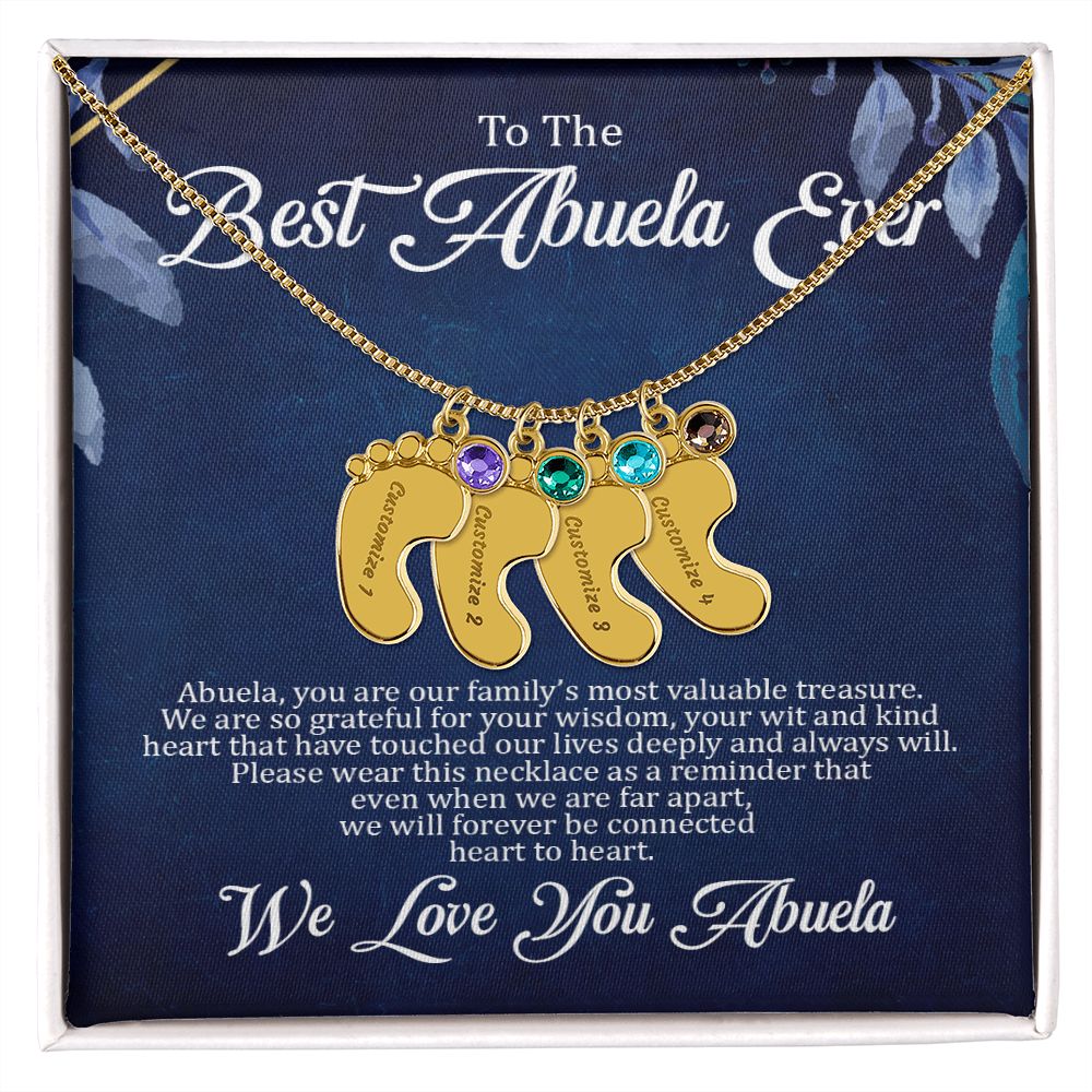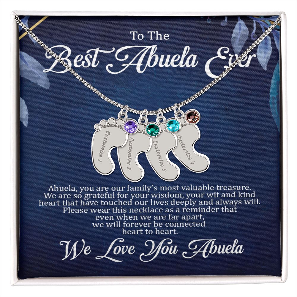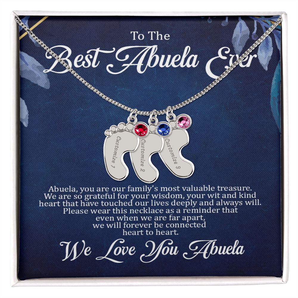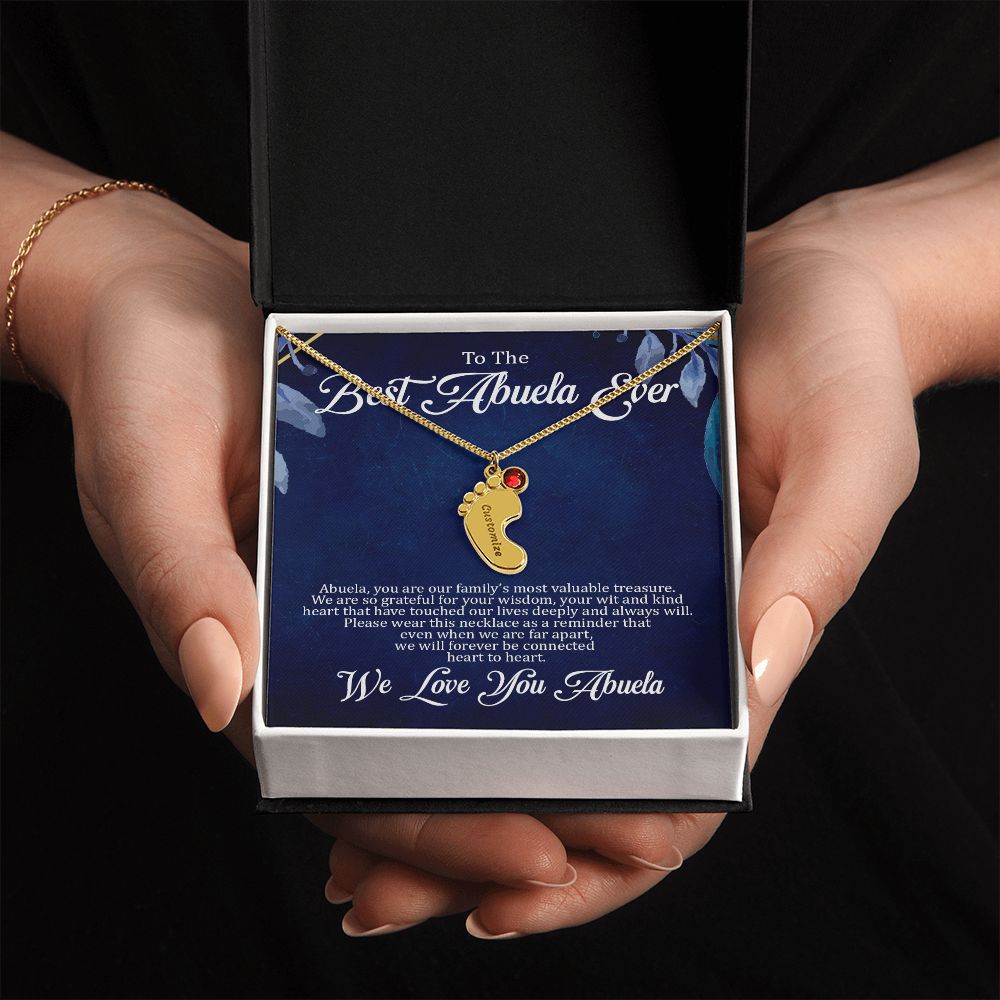 Your Abuela will be overcome with emotions when she sees this "Baby Feet" Necklace with the Engraved name of her grandchildren, with their corresponding birthstone, and a loving message from you: