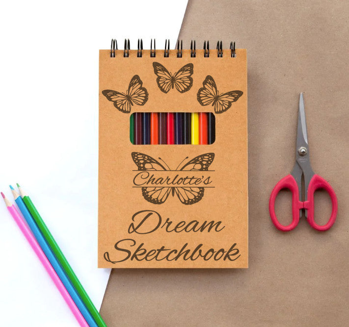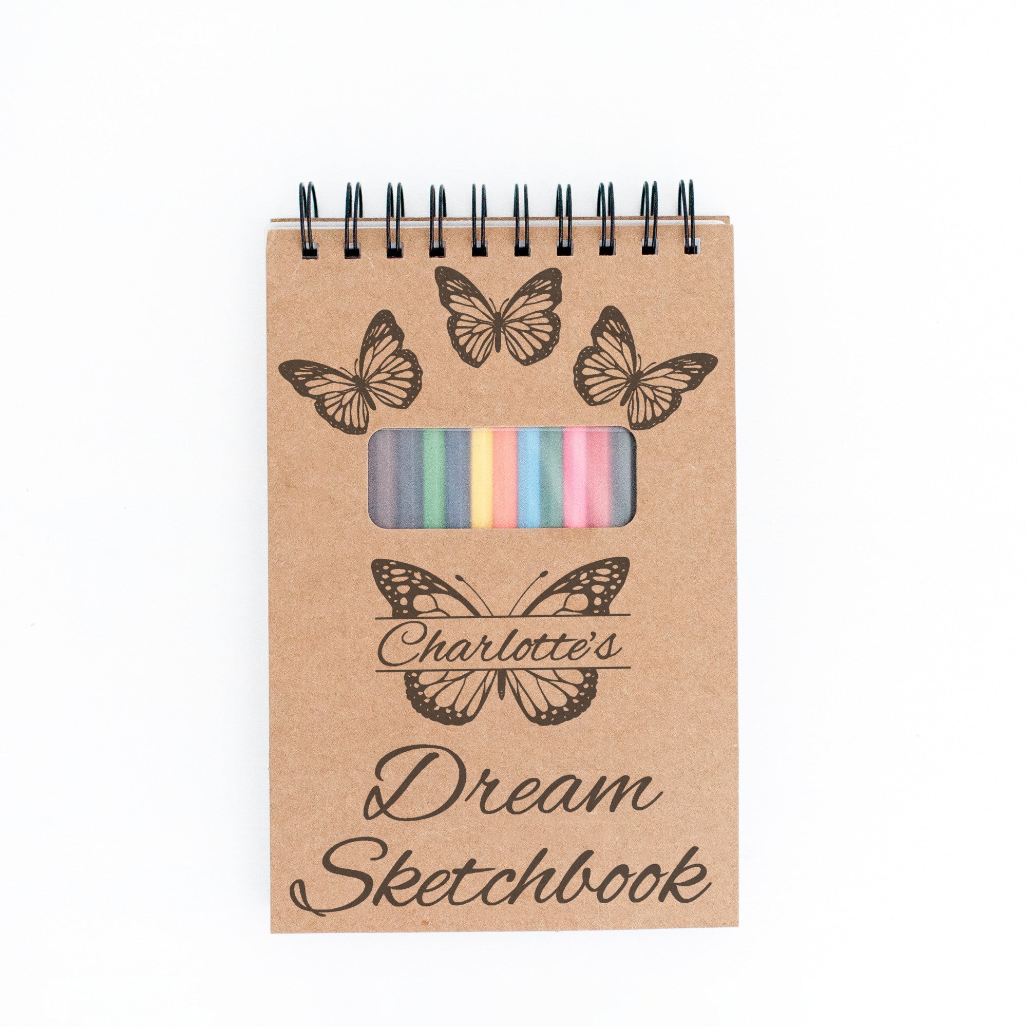 Custom Drawing "Butterfly Dreams" Sketchbook for Creative Kids and Adults- 12 Coloring Pencils - Personalized Sketch Pad Gift for Young Artist