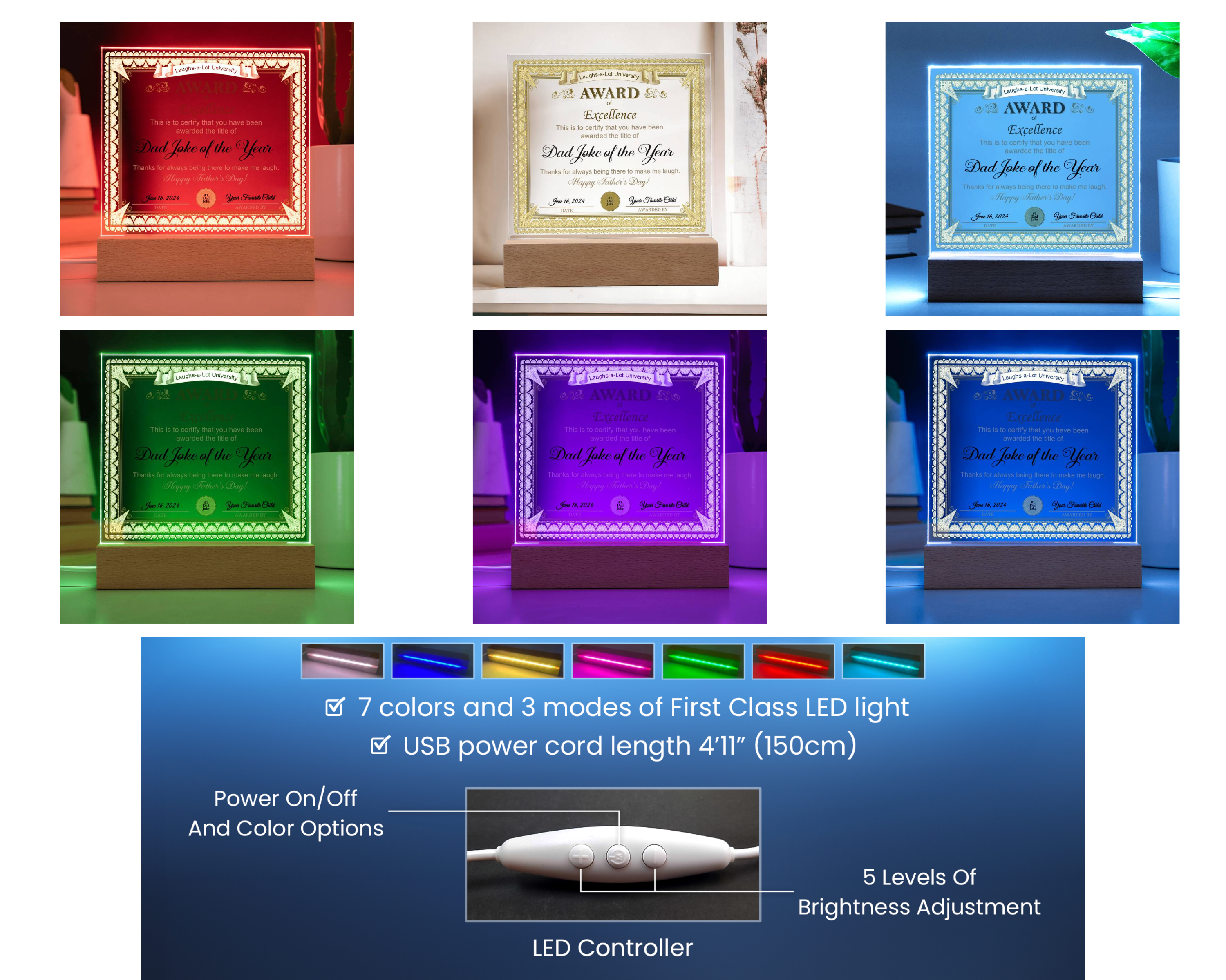 Create a memorable presentation when you upgrade to the LED wooden base with 7 colors, 3 modes, and a USB plug-in!