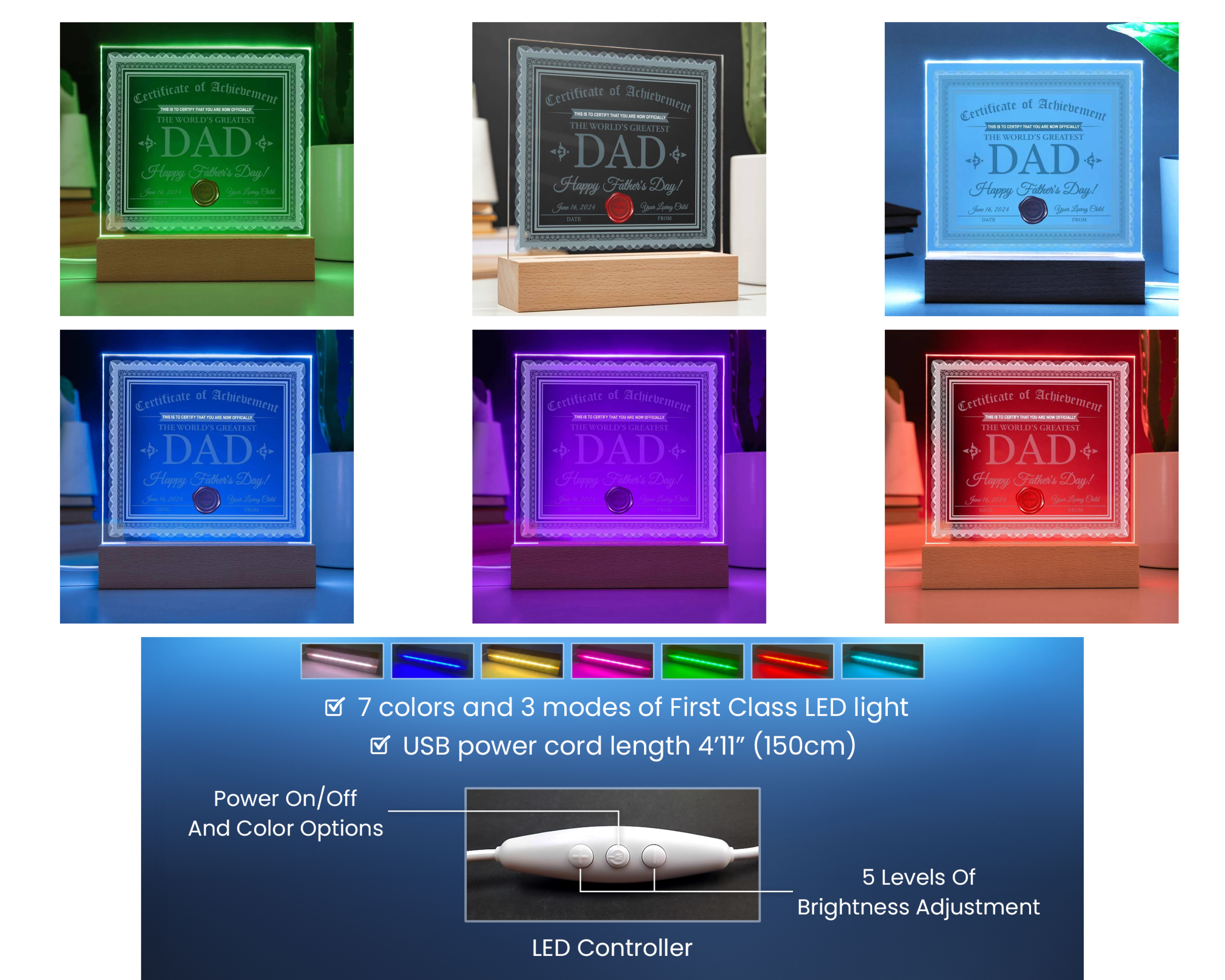 Create a memorable presentation when you upgrade to the LED wooden base with 7 colors, 3 modes, and a USB plug-in!
