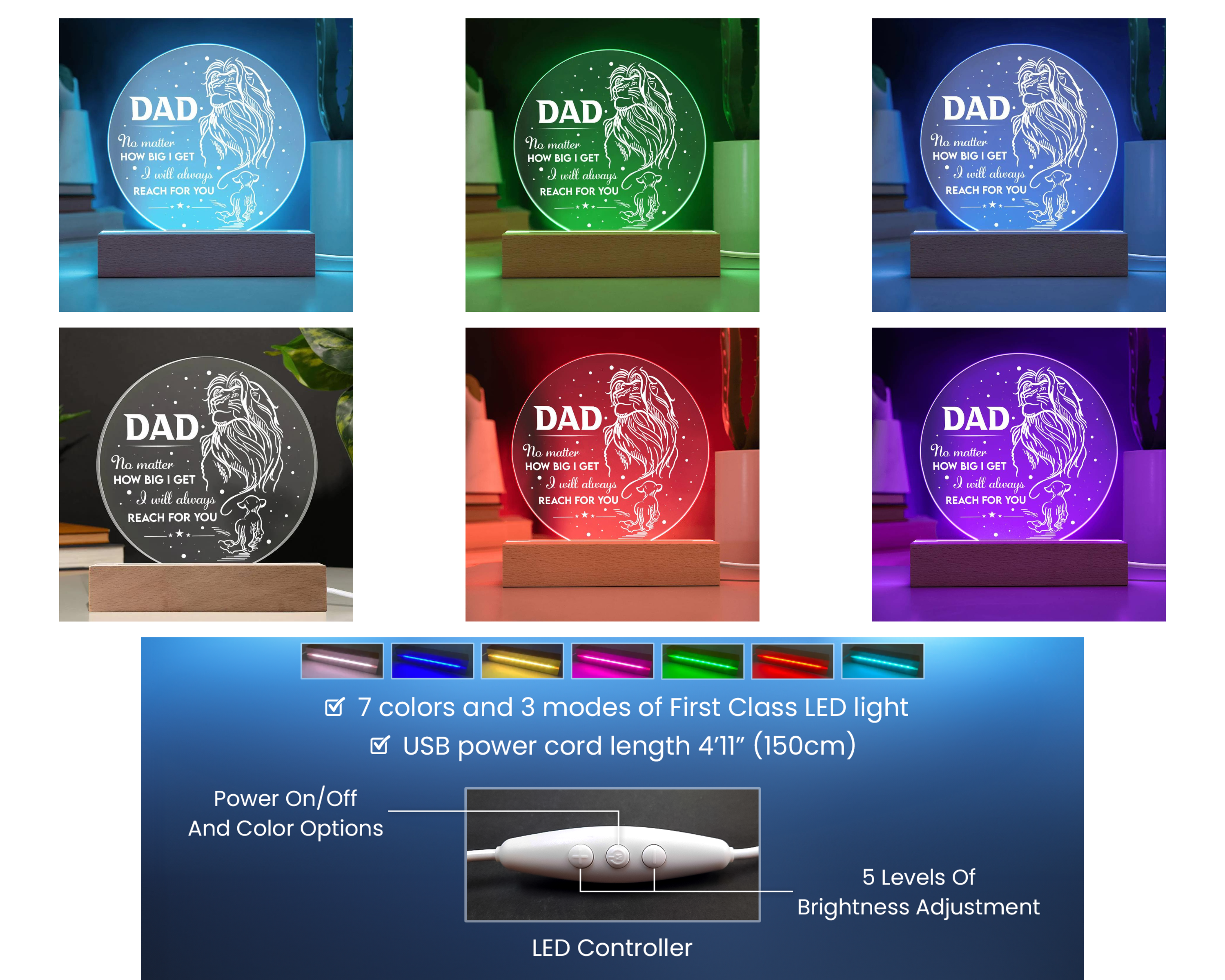 Your sign features a sleek wooden base, but you can elevate your presentation by upgrading to the wooden LED base with 7 colors, 3 modes, and a USB plug-in!