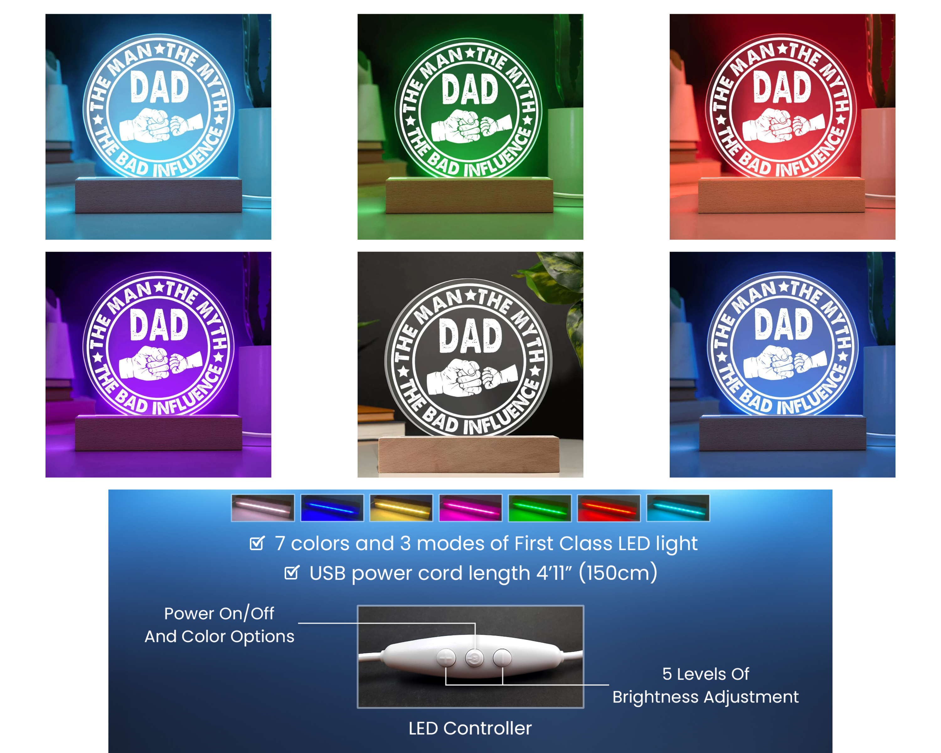 Your sign features a sleek wooden base, but you can elevate your presentation by upgrading to the wooden LED base with 7 colors, with 7 colors, 3 modes, and a USB plug-in!