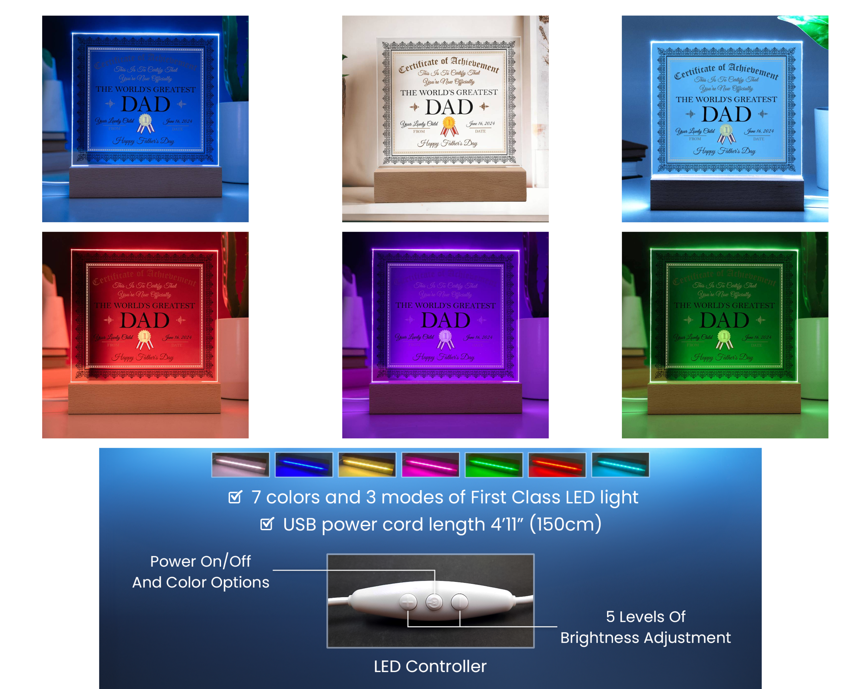 Create a memorable presentation when you upgrade to the LED wooden base with 7 colors, 3 modes, and a USB plug-in!