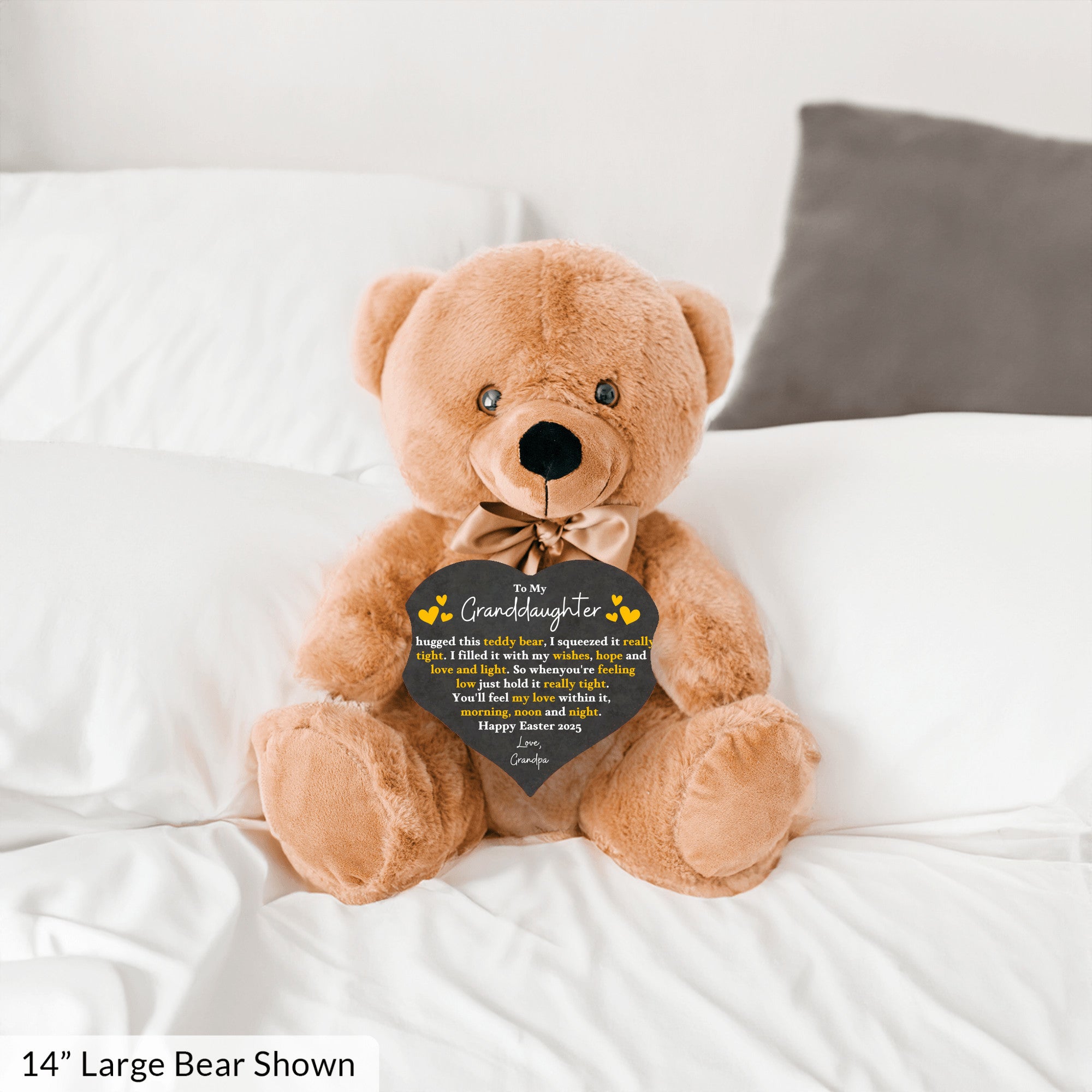 "To My Granddaughter, I hugged this teddy bear and squeezed it really tight. I filled it with my wishes, hope, love, and light. So when you're feeling low, just hold it really tight. You'll feel my love within it, morning, noon, and night. Happy Easter 2025, Love, Grandpa"