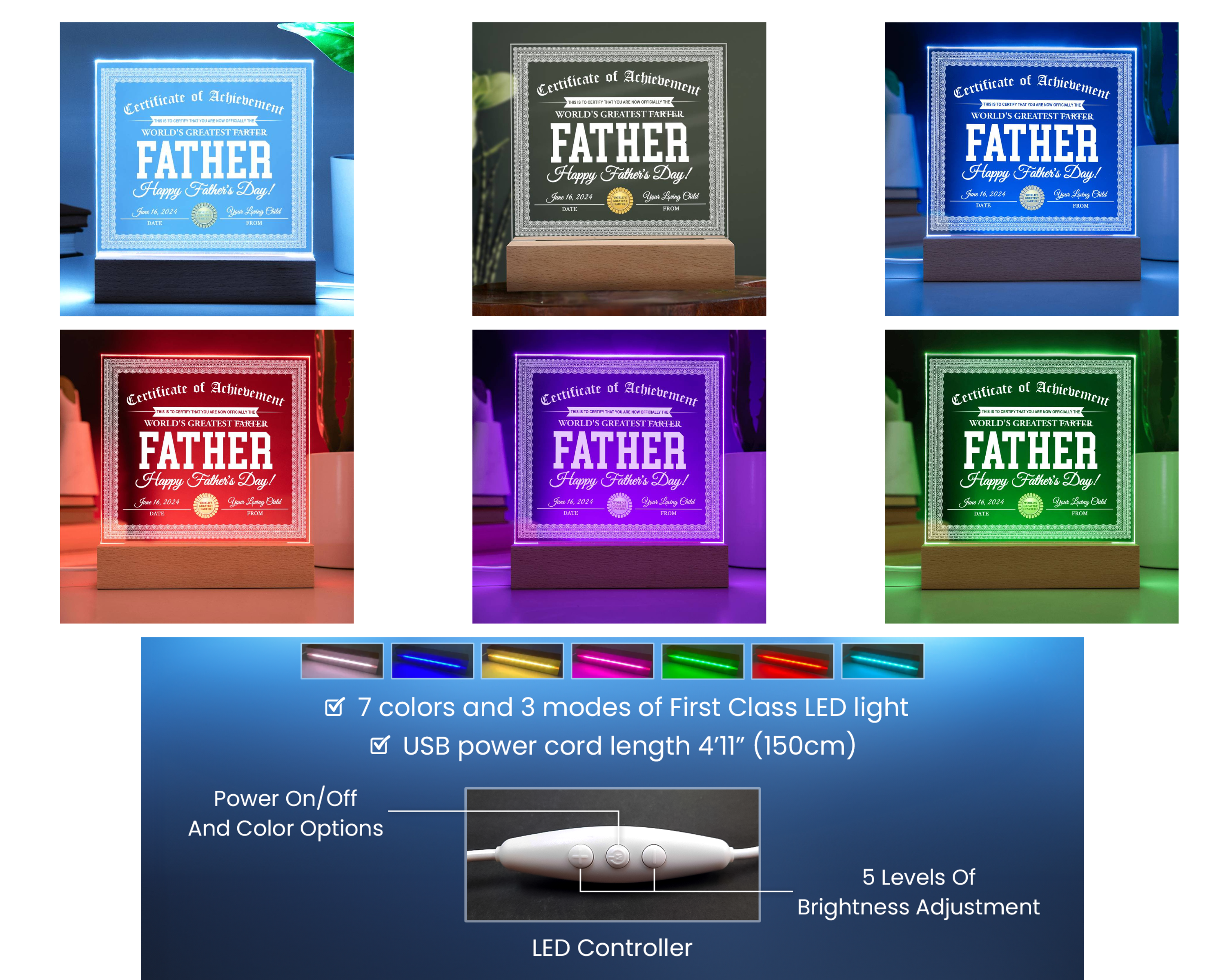 Create a memorable presentation when you upgrade to the LED wooden base with 7 colors, 3 modes, and a USB plug-in!