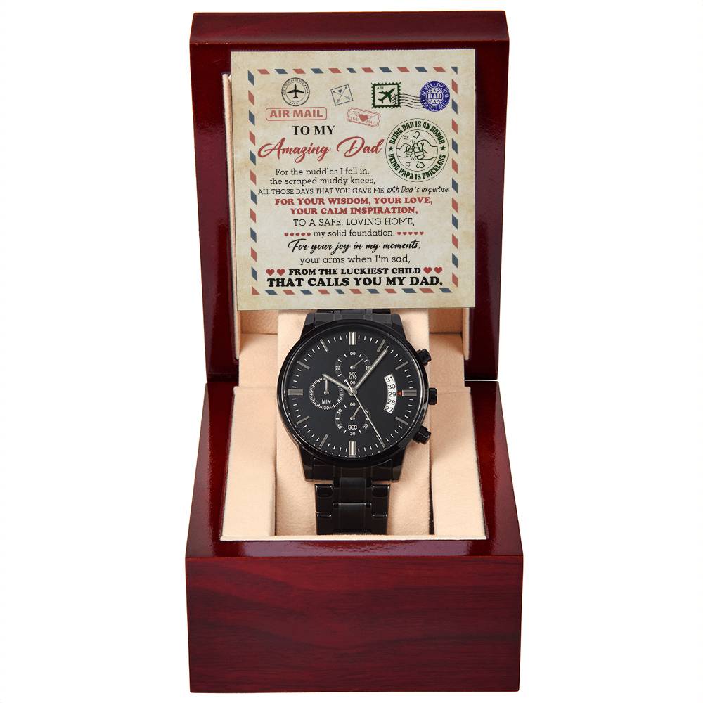 Gift For Dad - Mens Black Wrist Watch with Mahogany Box and Message Card - The Luckiest Child