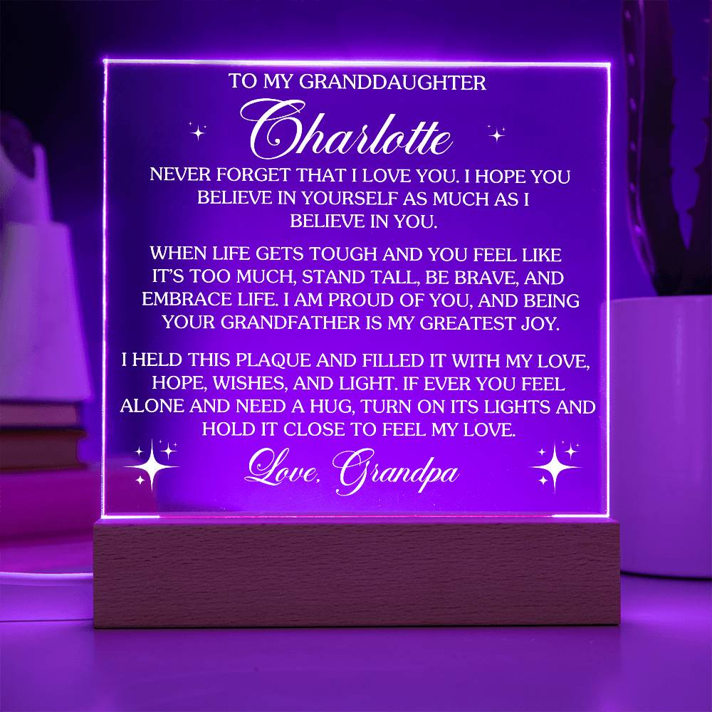 NEVER FORGET THAT I LOVE YOU. I HOPE YOU BELIEVE IN YOURSELF AS MUCH AS I BELIEVE IN YOU. WHEN LIFE GETS TOUGH AND YOU FEEL LIKE IT'S TOO MUCH, STAND TALL, BE BRAVE, AND EMBRACE LIFE. I AM PROUD OF YOU, AND BEING YOUR GRANDFATHER IS MY GREATEST JOY. I HELD THIS PLAQUE AND FILLED IT WITH MY LOVE, HOPE, WISHES, AND LIGHT. IF EVER YOU FEEL ALONE AND NEED A HUG, TURN ON ITS LIGHTS AND HOLD IT CLOSE TO FEEL MY LOVE.