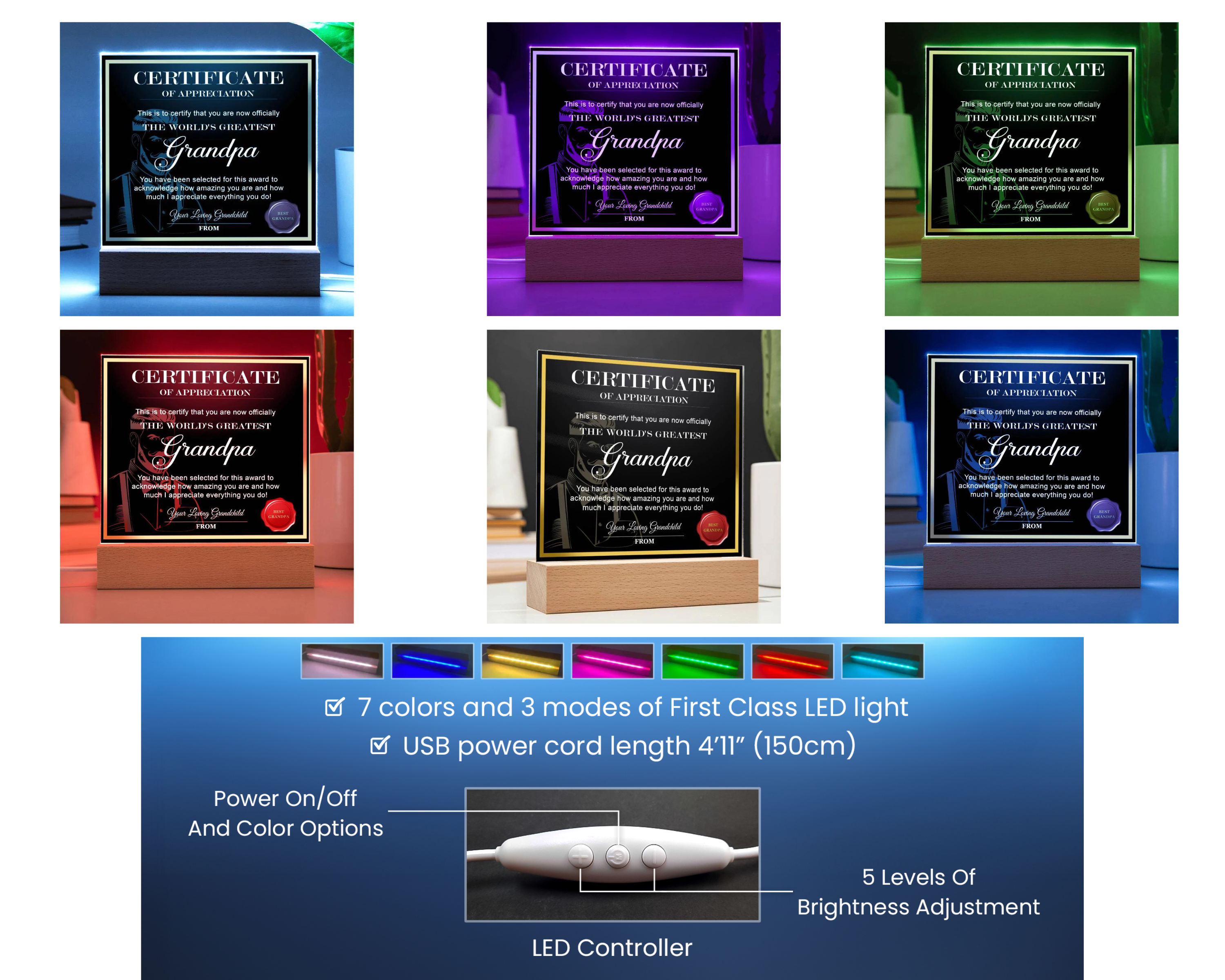 Create a memorable presentation when you upgrade to the LED wooden base with 7 colors, 3 modes, and a USB plug-in!