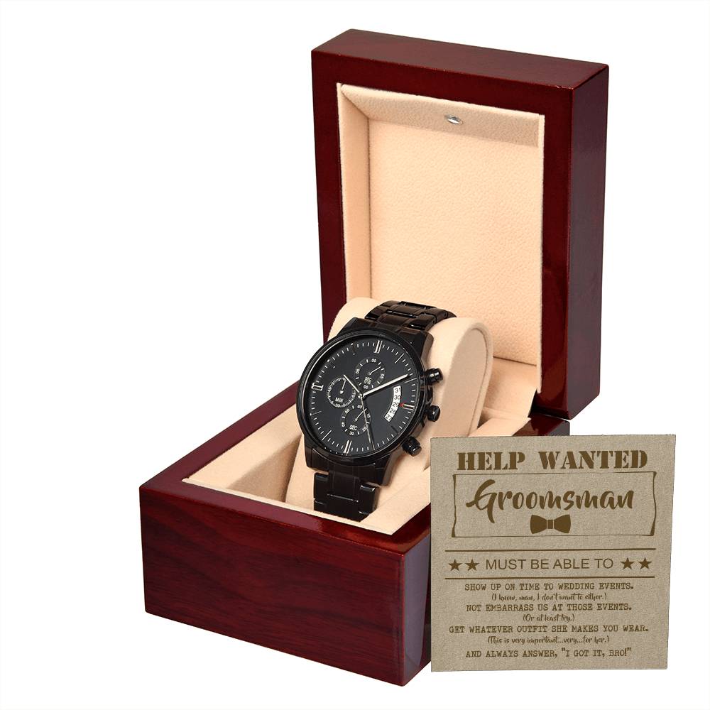 Groomsman Gift - Mens Black Wrist Watch with Mahogany Box and Message Card - Help Wanted