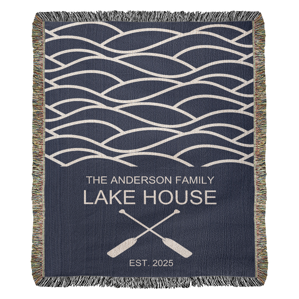 Personalized Woven Blanket for Lake House Owner - Family Name Lake House - Established - Waves and Paddles