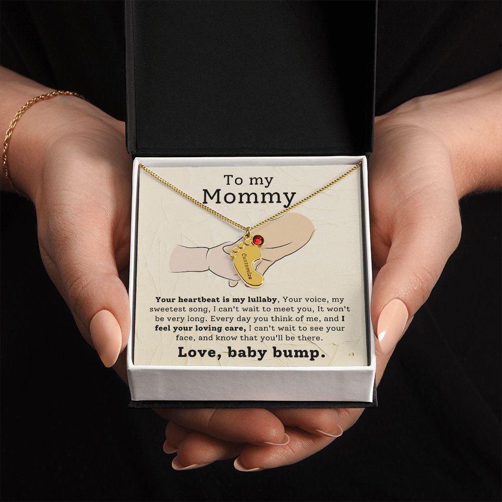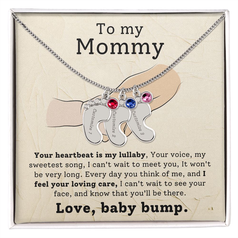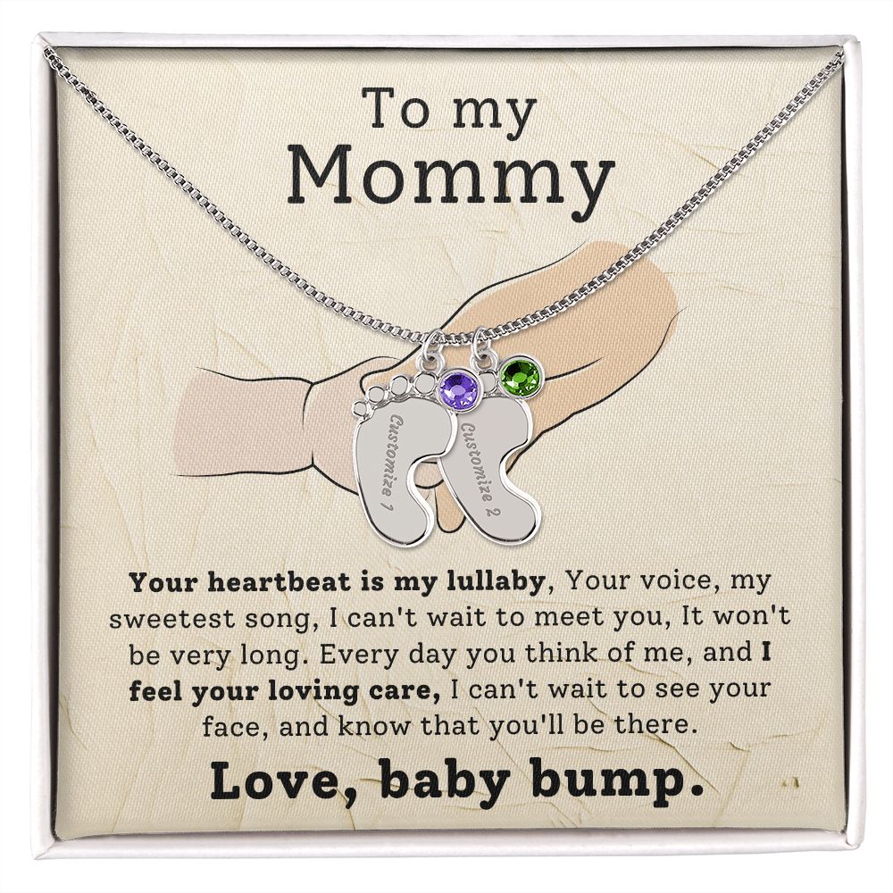 Mommy To Be - Engraved Baby Feet Necklace with Birthstone - Your Heartbeat Is My Lullaby- w/o lux box