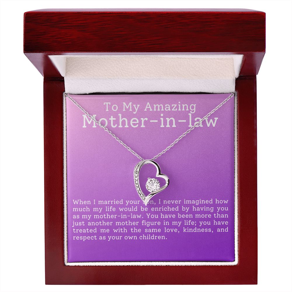 Surprise your Mother-in-Law with this dazzling Forever Love Necklace. It is sure to make her heart melt! She will tear up when she sees your gift along with the heartfelt, loving message card: