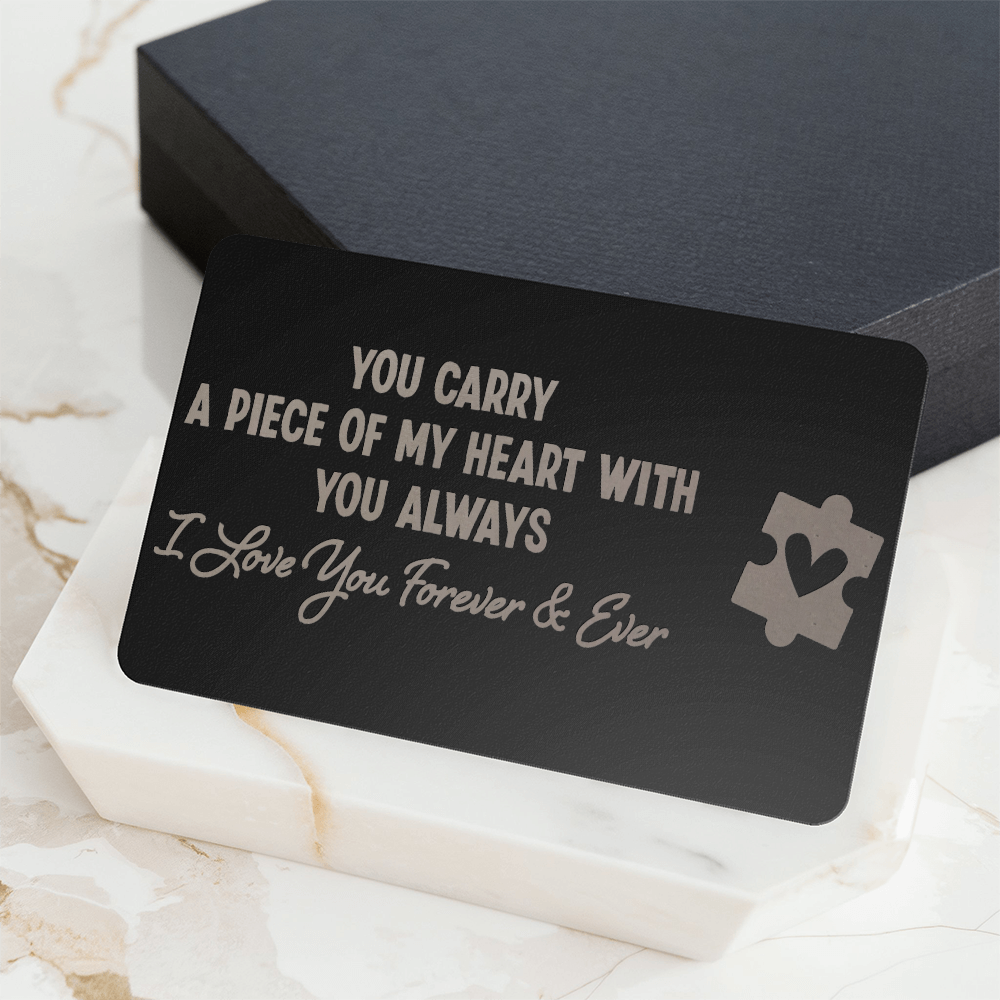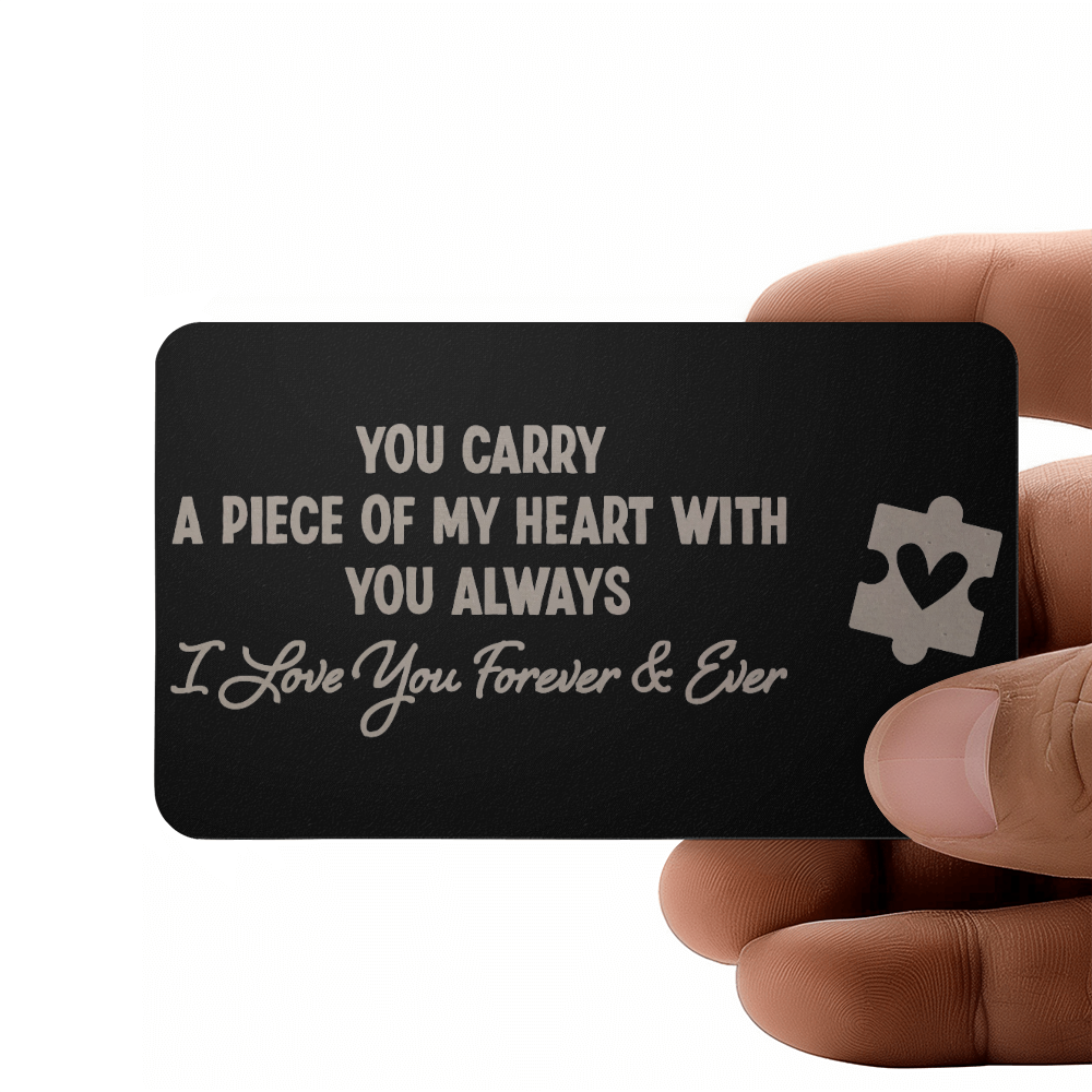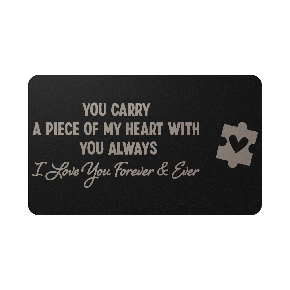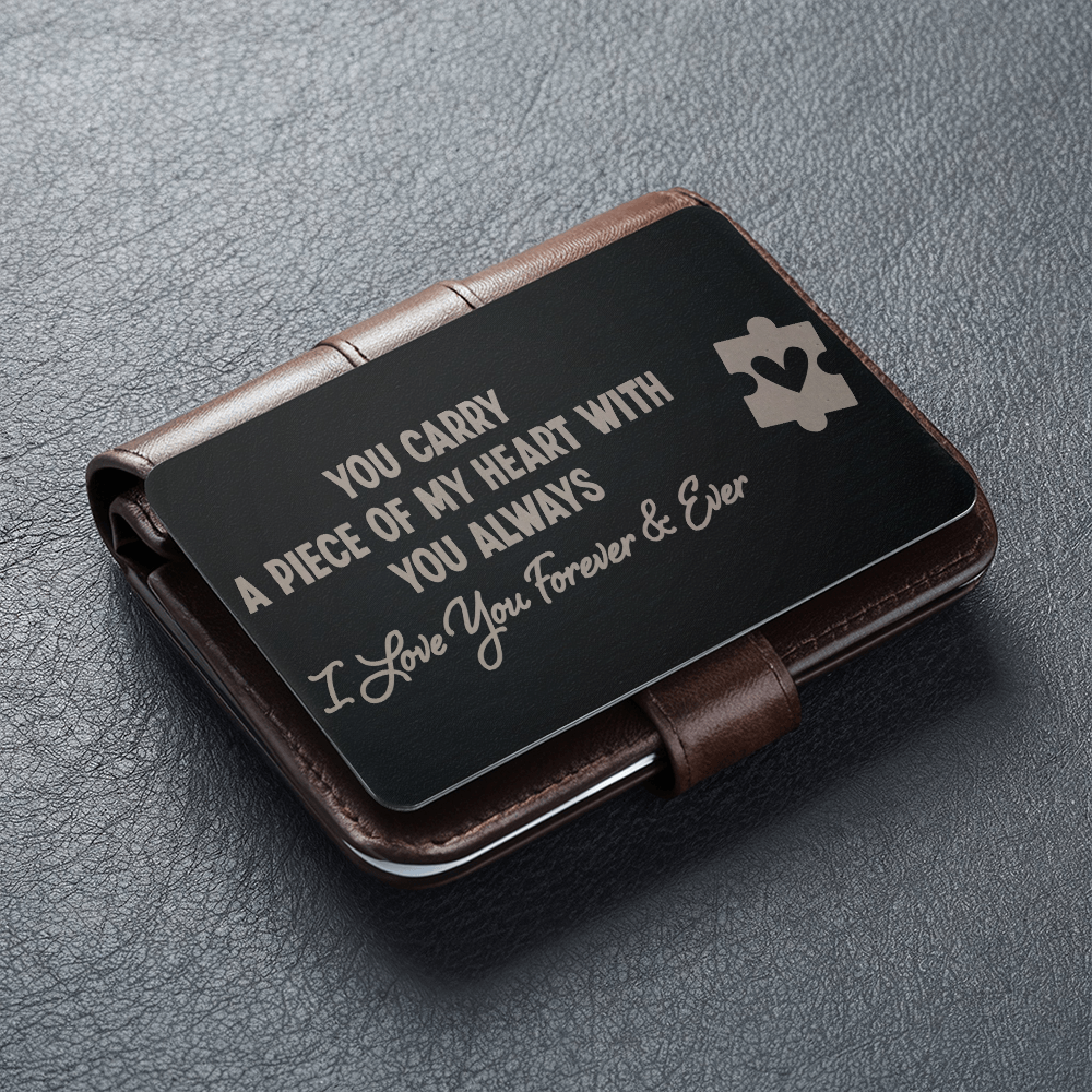 Give the gift of enduring sentiment with our Engraved Wallet Card. Perfect for any occasion, this sleek and lightweight card fits snugly into billfolds, pockets, agendas, and more, ensuring your message is always close to their heart. Crafted with precision and care, the brushed black finish beautifully contrasts with the bright silver engraving, making each word stand out with elegance. Order yours today and let your love and appreciation shine wherever they go.