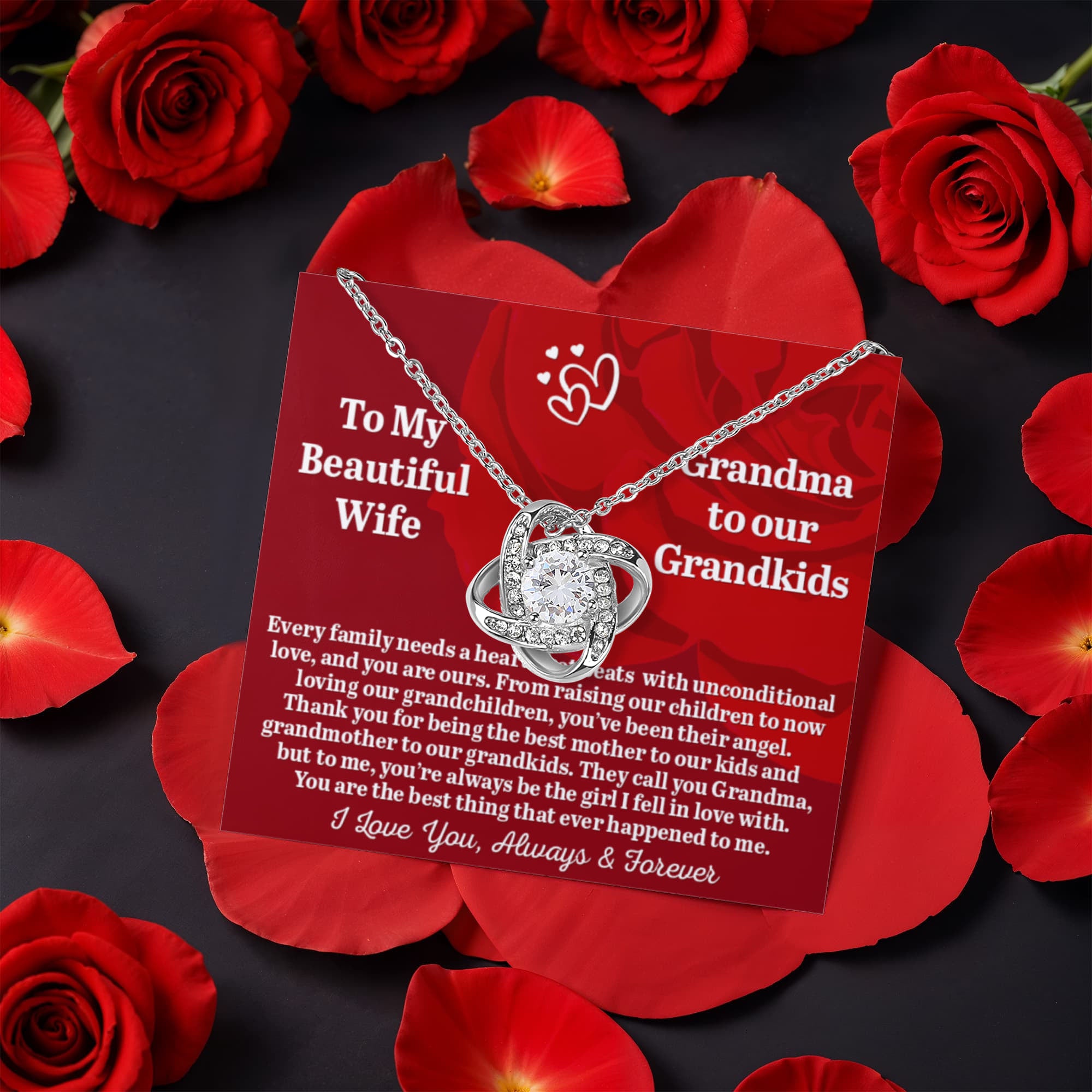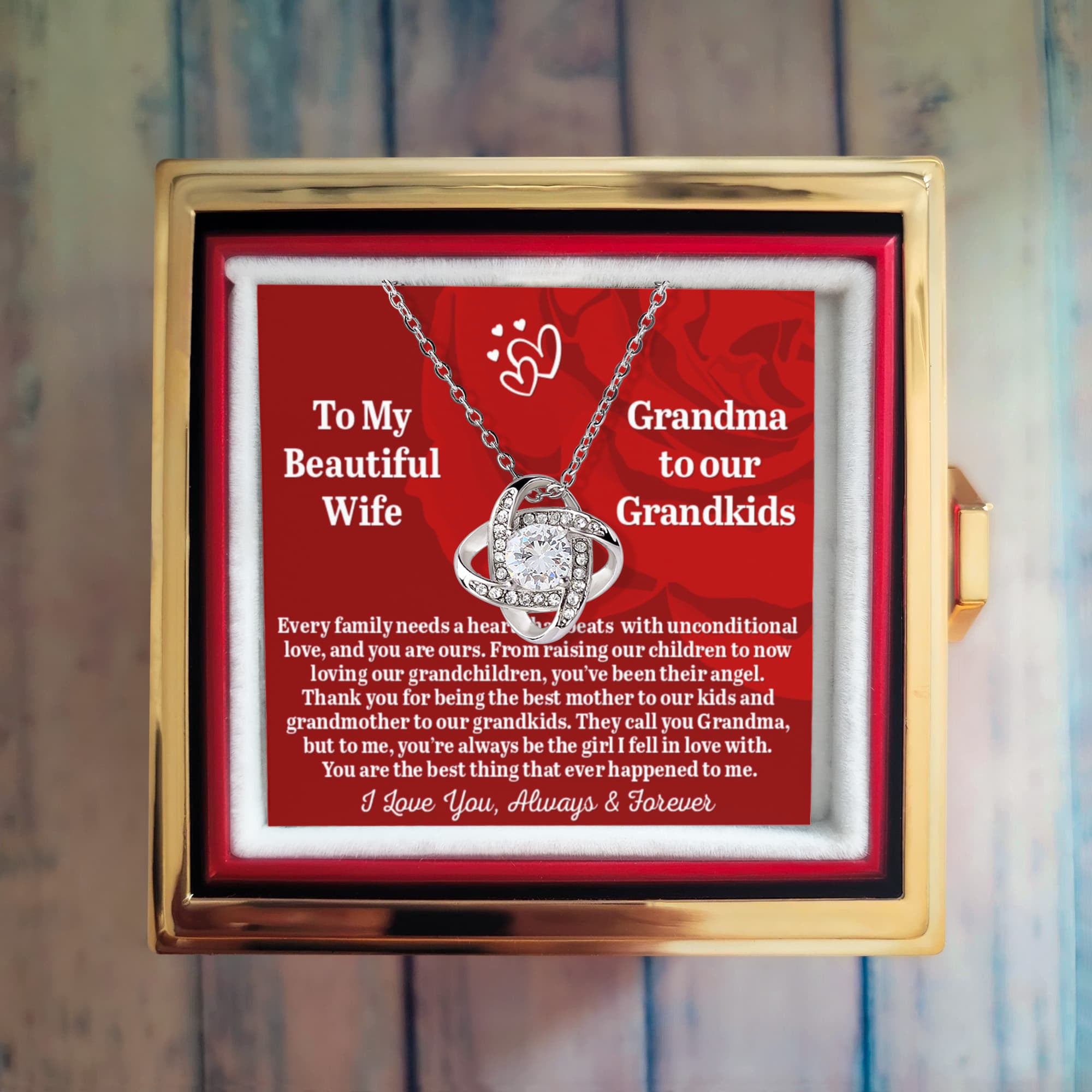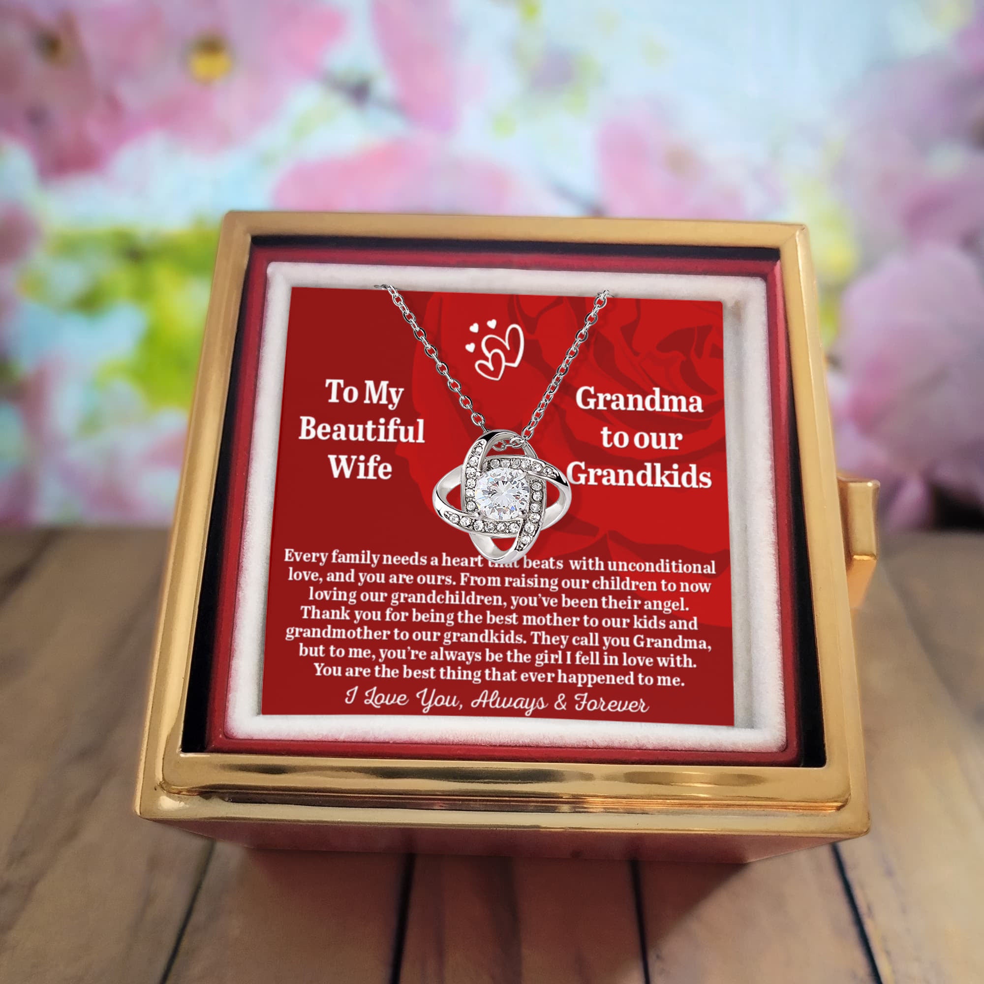 To My Beautiful Wife -Grandma To Our Grandkids - Love Knot Necklace with Rose in a Rotating Gift Box