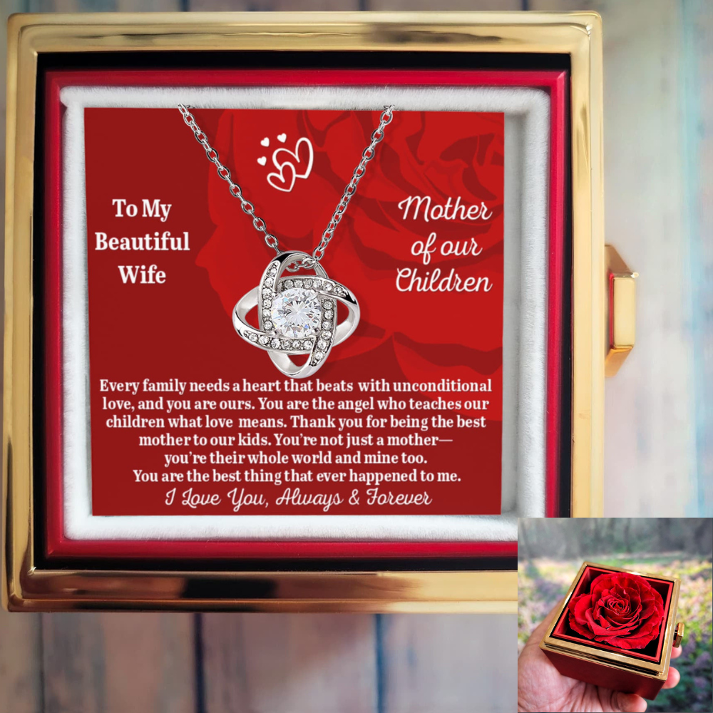 To My Beautiful Wife - Mother Of Our Children - Love Knot Necklace with Rose in a Rotating Gift Box