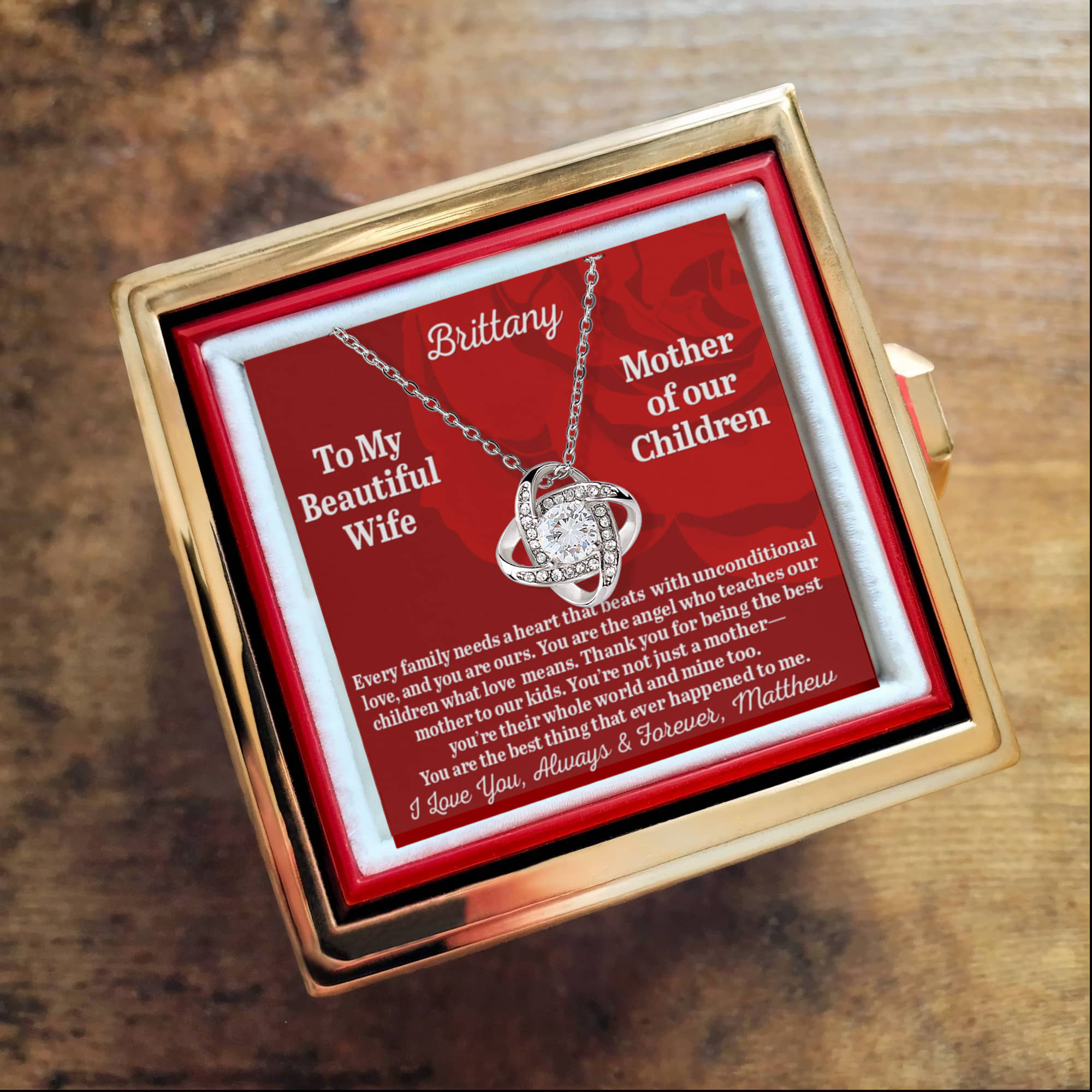 To My Beautiful Wife - Mother Of Our Children - Personalized Love Knot Necklace with Rose in a Rotating Gift Box